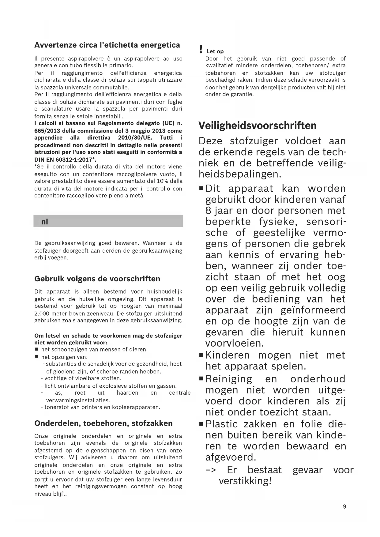 gebruiken zoals aangegeven in deze gebruiksaanwijzing. Om letsel en schade te voorkomen mag de stofzuiger niet worden gebruikt voor: het schoonzuigen van mensen of dieren. het opzuigen van: - substanties die schadelijk voor de gezondheid, heet of gloeiend zijn, of scherpe randen hebben. - vochtige of vloeibare stoffen. - licht ontvlambare of explosieve stoffen en gassen. - as, roet uit haarden en centrale verwarmingsinstallaties. - tonerstof van printers en kopieerapparaten. Onderdelen, toebehoren, stofzakken Onze originele onderdelen en originele en extra toebehoren zijn evenals de originele stofzakken afgestemd op de eigenschappen en eisen van onze stofzuigers. Wij adviseren u daarom om uitsluitend originele onderdelen en onze originele en extra toebehoren en originele stofzakken te gebruiken. Zo zorgt u ervoor dat uw stofzuiger een lange levensduur heeft en het reinigingsvermogen constant op hoog niveau blijft. ! Let op Door het gebruik van niet goed passende of kwalitatief mindere onderdelen, toebehoren/ extra toebehoren en stofzakken kan uw stofzuiger beschadigd raken. Indien deze schade veroorzaakt is door het gebruik van dergelijke producten valt hij niet onder de garantie. Veiligheidsvoorschriften Deze stofzuiger voldoet aan de erkende regels van de tech- niek en de betreffende veilig- heidsbepalingen. Dit apparaat kan worden gebruikt door kinderen vanaf 8 jaar en door personen met beperkte fysieke, sensori- sche of geestelijke vermo- gens of personen die gebrek aan kennis of ervaring heb- ben, wanneer zij onder toe- zicht staan of met het oog op een veilig gebruik volledig over de bediening van het apparaat zijn geïnformeerd en op de hoogte zijn van de gevaren die hieruit kunnen voorvloeien. Kinderen mogen niet met het apparaat spelen. Reiniging en onderhoud mogen niet worden uitge- voerd door kinderen als zij niet onder toezicht staan. Plastic zakken en folie die- nen buiten bereik van kinde- ren te worden bewaard en afgevoerd. => Er bestaat gevaar voor verstikking!10 Juist gebruik De stofzuiger alleen volgens het typeplaatje aansluiten en in gebruik nemen. Nooit zuigen zonder filterzak of stofreservoir, motorbeveiligings - en uitblaasfilter. => Het apparaat kan beschadigd raken! Zuig nooit met mondstuk en buis in de nabijheid van het hoofd. => Er bestaat gevaar voor letsel! Bij het zuigen op trappen moet het toestel altijd onder de gebruiker staan. Het elektriciteitssnoer en de slang niet gebruiken om de stofzui-ger te dragen / transporteren. Raakt de voedingskabel van dit apparaat beschadigd, dan dient deze door de fabrikant, zijn servicedienst of iemand met de juiste kwalificaties te worden vervangen, ter voorkoming van gevaarlijke situaties. Bij een gebruiksduur van langer dan 30 minuten het elektriciteitssnoer volledig uittrekken. Niet aan het elektriciteitssnoer maar aan de stekker trekken om het apparaat van het net te koppelen. Het elektriciteitssnoer niet over scherpe kanten trekken en niet bekneld laten raken. Let erop dat de netstekker niet tegen personen, lichaamsdelen, dieren of voorwerpen slaat wanneer het snoer automatisch wordt ingetrokken. => Leid het elektriciteitssnoer met behulp van de netstekker. Voor alle werkzaamheden aan de stofzuiger de stekker uit het stopcontact halen. De stofzuiger niet in gebruik nemen wanneer hij beschadigd is. In het geval zich een storing voordoet de stekker uit het stopcontact halen. Om risico's te voorkomen mogen reparaties aan de stofzuiger en de vervanging van onderdelen alleen worden uitgevoerd door onze klantenservice. De stofzuiger beschermen tegen weersinvloeden, vocht en hittebronnen. Zorg ervoor dat er geen brandbare of alcoholhoudende stoffen op de filters (filterzak, motorbeveiligingsfilter, uitblaasfilter, etc.) terechtkomen. De stofzuiger is niet geschikt voor gebruik op bouwplaatsen. => Opzuigen van bouwpuin kan leiden tot beschadiging van het toestel. Wanneer de stofzuiger niet gebruikt wordt het toestel uitschakelen en de stekker uit het stopcontact halen. Versleten apparaten onmiddellijk onbruikbaar maken, het toestel daarna op een verantwoorde wijze afvoeren. !Let op Als de zekering in de meterkast bij het inschakelen van het toestel wordt geactiveerd, dan kan dit worden veroorzaakt doordat er tegelijkertijd meerdere elektrische apparaten met hoge aansluitwaarde op hetzelfde stroomcircuit zijn aangesloten. De zekering wordt onvermijdelijk geactiveerd wanneer u alvorens het toestel aan te zetten de laagste stand instelt en pas daarna een hogere stand kiest. Instructies voor recycling Verpakking De verpakking beschermt de stofzuiger tegen beschadiging tijdens het transport. Deze bestaat uit milieuvriendelijk materiaal en is daarom recyclebaar. Breng verpakkingsmateriaal dat u niet meer nodig heeft naar een verzamelplaats voor de verwerking van afval. Oude toestellen Oude apparaten bevatten vaak nog waardevol materiaal. Geef daarom uw oude toestel voor hergebruik af aan uw handelaar of een recyclecentrum. Informatie over actuele methoden van afvalverwijdering kunt u krijgen bij uw handelaar of uw gemeente. Afvoer van filters en filterzakken Filter en filterzak zijn gemaakt van milieuvriendelijke materialen. Voor zover deze geen stoffen bevatten die niet toegestaan zijn als huisvuil, kunnen ze via het normale huisvuil worden afgevoerd. Informatie op het energielabel Dit is een stofzuiger met een basisslang, bestemd voor algemene doeleinden. Om op tapijt en harde vloeren de beste energie-effi- ciëntie te bereiken, kunt u het omschakelbare universe- le mondstuk gebruiken. Om op harde vloeren met naden en krassen de aange- geven energie-efficiëntie en reinigingsklasse te berei- ken, kunt u het bijgevoegde mondstuk voor harde vloe- ren, zonder de opklikbare borstelkrans, gebruiken. De berekeningen zijn gebaseerd op de Gedelegeerde Verordening (EU) Nr. 665/2013 van de Commissie van 3 mei 2013 ter aanvulling van richtlijn 2010/30/EU. Alle procedures die niet precies in deze handleiding beschreven staan, zijn uitgevoer
