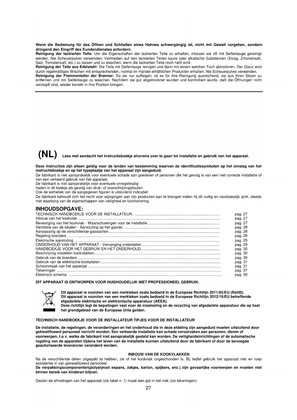 (NL) Lees met aandacht het instructieboekje alvorens over te gaan tot installatie en gebruik van het apparaat. Deze instructies zijn alleen geldig voor de landen van bestemming waarvan de identificatiesymbolen op het omslag van het instructieboekje en op het typeplaatje van het apparaat zijn aangeduid. De fabrikant is niet aansprakelijk voor eventuele schade aan goederen of personen die het gevolg is van een niet correcte installatie of van een verkeerd gebruik van het apparaat. De fabrikant is niet aansprakelijk voor eventuele onregelmatig- heden in dit boekje als gevolg van druk- of overschrijvingsfouten. Ook de esthetiek van de aangegeven figuren is uitsluitend indicatief. De fabrikant behoudt zich het recht voor wijzigingen aan zijn producten aan te brengen indien hij dit nuttig en noodzakelijk acht, steeds met waarborg van de eigenschappen van veiligheid en functionering. INHOUDSOPGAVE: TECHNISCH HANDBOEKJE VOOR DE INSTALLATEUR.. ............................................................................... pag. 27 Inbouw van het kookvlak ..................................................................................................................................... pag. 27 Bevestiging van het kookvlak - Waarschuwingen voor de installatie ................................................................... pag. 27 Ventilatie van de lokalen - Aansluiting op het gasnet. ......................................................................................... pag. 28 Aanpassing op de verschillende gassoorten........................................................................................................ pag. 28 Regeling branders .............................................................................................................................................. pag. 28 Elektrische aansluiting ........................................................................................................................................ pag .29 ONDERHOUD VAN HET APPARAAT - Vervanging onderdelen......................................................................... pag. 29 HANDBOEKJE VOOR HET GEBRUIK EN HET ONDERHOUD.......................................................................... pag. 30 Beschrijving modellen kookvlakken...................................................................................................................... pag. 30 Gebruik van de branders ..................................................................................................................................... pag. 30 Gebruik van de elektrische kookplaten ................................................................................................................ pag. 31 Schoonmaak van het apparaat ............................................................................................................................ pag. 31 Tekeningen .......................................................................................................................................................... pag. 37 Elektrisch schema ............................................................................................................................................... pag. 39 DIT APPARAAT IS ONTWORPEN VOOR HUISHOUDELIJK NIET PROFESSIONEEL GEBRUIK. Dit apparaat is voorzien van een merkteken zoals bedoeld in de Europese Richtlijn 2011/65/EU (RoHS) Dit apparaat is voorzien van een merkteken zoals bedoeld in de Europese Richtlijn 2012/19/EU betreffende afgedankte elektrische en elektronische apparatuur (AEEA). Deze richtlijn legt de bepalingen vast voor de inzameling en de recycling van afgedankte apparatuur die op heel het grondgebied van de Europese Unie gelden.