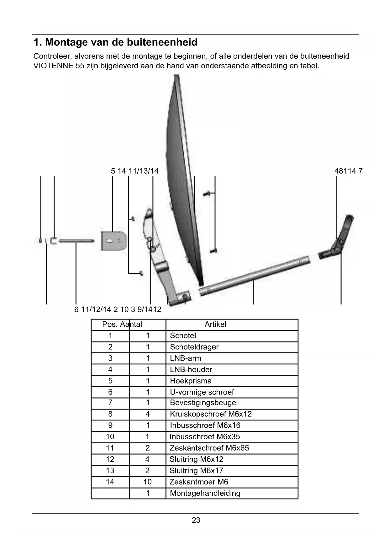 Controleer, alvorens met de montage te beginnen, of alle onderdelen van de buiteneenheid VIOTENNE 55 zijn bijgeleverd aan de hand van onderstaande afbeelding en tabel.