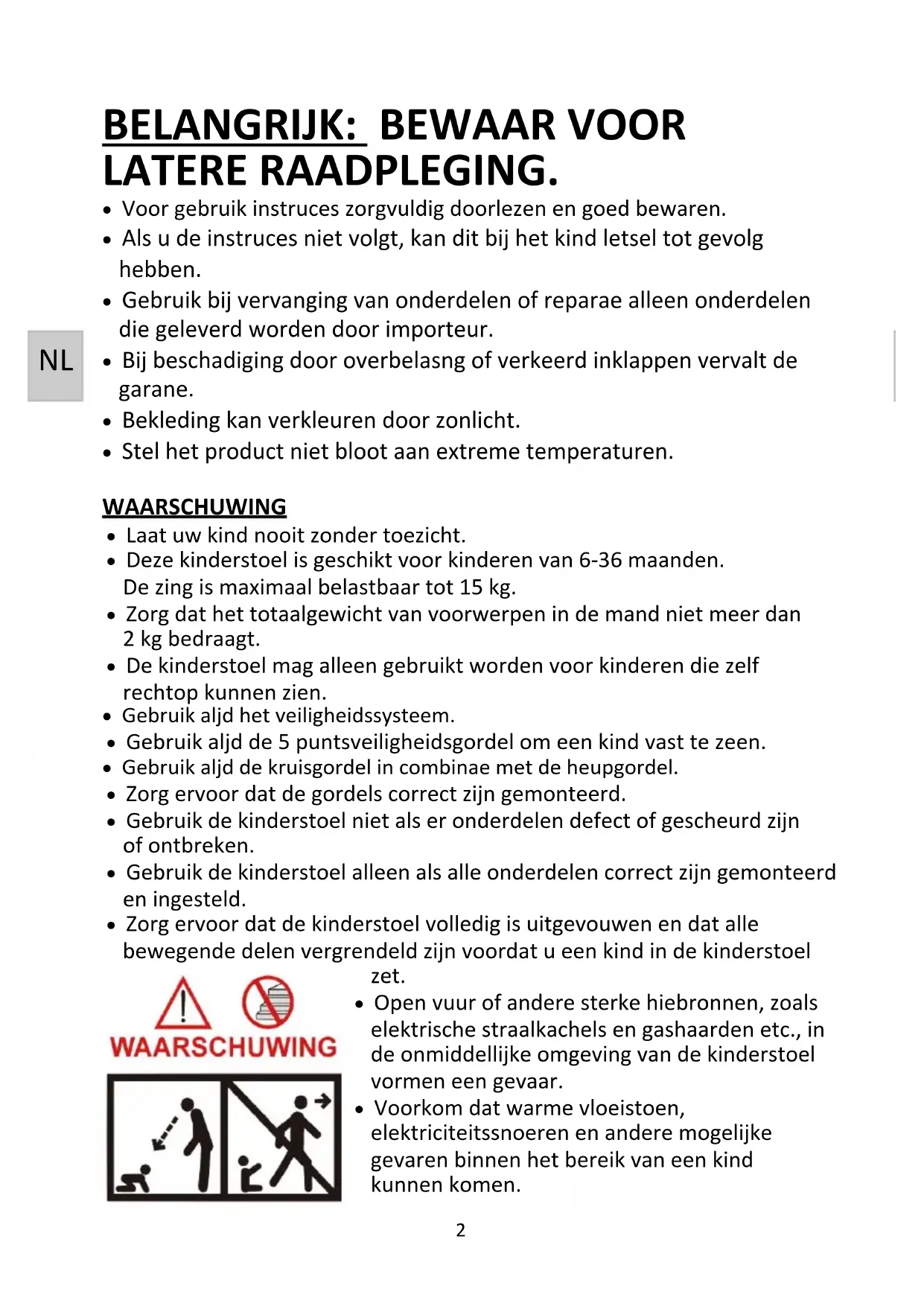 LATERE RAADPLEGING. Voor gebruik instructies zorgvuldig doorlezen en goed bewaren. Als u de instructies niet volgt, kan dit bij het kind letsel tot gevolg hebben. Gebruik bij vervanging van onderdelen of reparatie alleen onderdelen die geleverd worden door importeur. Bij beschadiging door overbelasting of verkeerd inklappen vervalt de garantie. Bekleding kan verkleuren door zonlicht. Stel het product niet bloot aan extreme temperaturen. WAARSCHUWING Laat uw kind nooit zonder toezicht. Deze kinderstoel is geschikt voor kinderen van 6-36 maanden. De zitting is maximaal belastbaar tot 15 kg. Zorg dat het totaalgewicht van voorwerpen in de mand niet meer dan 2 kg bedraagt. De kinderstoel mag alleen gebruikt worden voor kinderen die zelf rechtop kunnen zitten. Gebruik altijd het veiligheidssysteem. Gebruik altijd de 5 puntsveiligheidsgordel om een kind vast te zetten. Gebruik altijd de kruisgordel in combinatie met de heupgordel. Zorg ervoor dat de gordels correct zijn gemonteerd. Gebruik de kinderstoel niet als er onderdelen defect of gescheurd zijn of ontbreken. Gebruik de kinderstoel alleen als alle onderdelen correct zijn gemonteerd en ingesteld. Zorg ervoor dat de kinderstoel volledig is uitgevouwen en dat alle bewegende delen vergrendeld zijn voordat u een kind in de kinderstoel zet. Open vuur of andere sterke hittebronnen, zoals elektrische straalkachels en gashaarden etc., in de onmiddellijke omgeving van de kinderstoel vormen een gevaar. Voorkom dat warme vloeistoffen, elektriciteitssnoeren en andere mogelijke gevaren binnen het bereik van een kind kunnen komen. NL3