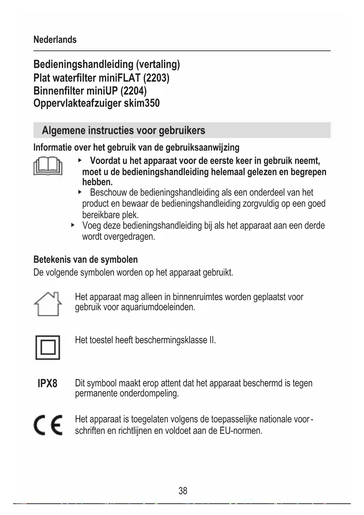 Bedieningshandleiding (vertaling) Plat waterlter miniFLAT (2203) Binnenlter miniUP (2204) Oppervlakteafzuiger skim350 Algemene instructies voor gebruikers Informatie over het gebruik van de gebruiksaanwijzing ▶ Voordat u het apparaat voor de eerste keer in gebruik neemt, moet u de bedieningshandleiding helemaal gelezen en begrepen hebben. ▶ Beschouw de bedieningshandleiding als een onderdeel van het product en bewaar de bedieningshandleiding zorgvuldig op een goed bereikbare plek. ▶ Voeg deze bedieningshandleiding bij als het apparaat aan een derde wordt overgedragen. Betekenis van de symbolen De volgende symbolen worden op het apparaat gebruikt. Het apparaat mag alleen in binnenruimtes worden geplaatst voor gebruik voor aquariumdoeleinden. Het toestel heeft beschermingsklasse II. Dit symbool maakt erop attent dat het apparaat beschermd is tegen permanente onderdompeling. Het apparaat is toegelaten volgens de toepasselijke nationale voor