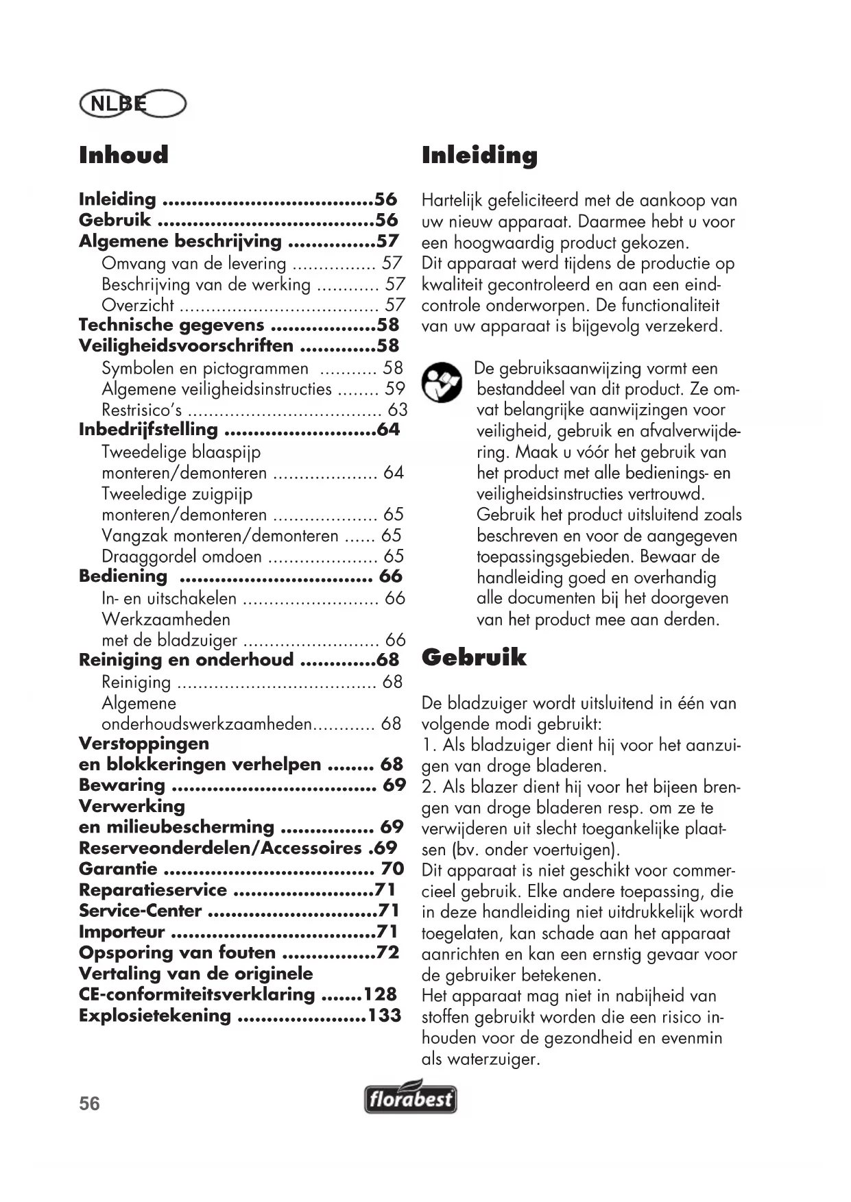 gen van droge bladeren resp. om ze te verwderen uit slecht toegankelke plaat- sen (bv. onder voertuigen). Dit apparaat is niet geschikt voor commer- cieel gebruik. Elke andere toepassing, die in deze handleiding niet uitdrukkelk wordt toegelaten, kan schade aan het apparaat aanrichten en kan een ernstig gevaar voor de gebruiker betekenen. Het apparaat mag niet in nabheid van stoffen gebruikt worden die een risico in- houden voor de gezondheid en evenmin als waterzuiger. Vertaling van de originele CE-conformiteitsverklaring .......128 Explosietekening ......................13357 BENL De bediener of gebruiker van het appa- raat is verantwoordelk voor ongelukken of schades aan andere personen of hun eigendom.De producent is niet verantwoor- delk voor beschadigingen, die door on- rechtmatig gebruik of verkeerde bediening worden veroorzaakt. Een bladblazer kan niet worden gebruikt voor het opzuigen van vocht! Voorkom het opzuigen van nat materiaal (blad en vuil, takken, twgen, dennenappels, gras, aarde, zand, boomschors/houtsnippers, enz.). Zuig niet op vochtige of natte gazons, gras of weiden. Verkeerd gebruik kan leiden tot verstoppingen in de versnipperruimte, waardoor de machine minder goed functioneert. Het apparaat moet in dat geval vol- ledig uit elkaar worden genomen en gereinigd. Deze werkzaamheden mogen alleen worden uitgevoerd door vallen niet onder de garantie. Algemene beschrijving De afbeeldingen vindt u op de voorste en achterste uitklapba- re bladzijde. Omvang van de levering Pak het apparaat uit en controleer, of de inhoud volledig is. Zorg voor een regle- mentair voorgeschreven afvalverwdering van het verpakkingsmateriaal. - Elektrische bladzuiger/-blazer - Blaasbuis (2-delig) - Zuigpp (2-delig) - Vangzak - Draaggordel - Gebruiksaanwijzing Beschrijving van de werking De elektrische bladzuiger beschikt over een zuig-/blaassysteem voor de functies blazen en zuigen. In de bedrfsmodus blazen kan het blad snel b elkaar of van moeilk be- reikbare plaatsen worden geblazen. In de bedrfsmodus zuigen wordt het opgezogen blad versnipperd, zodat het minder ruimte inneemt. Vervolgens wordt het versnipperde blad in de opvangzak geblazen. De opvangzak is aan een kant van binnen gecoat, waardoor stof en vocht niet naar buiten wordt geblazen. In de onderstaande omschrvingen staat de functie van de bedieningsonderdelen omschreven. Overzicht K L M N O P Q R S T U V W X Y Z A B C D E F G H I J 1 Motorbehuizing 2 Volumeregelaar 3 Handgreep 4 Schakelaar “Aan/uit” 5 Trekontlasting van de kabel 6 Stekker 7 Beschermende afdekking aanzui- gopening 8 Vergrendelknop blaasopening (niet zichtbaar) 9 Blaasbuis (2-delig) 10 Bkomende handgreep 11a/b Bevestigingsogen voor draaggordel 12 Draaggordel 13 Schroef met stervormige greep, zuigpijp 14 Vangzak 15 Bevestigingsoog opvangzak 16 Zuigpp (2-delig) 17 Schroef met stervormige greep, Hulphandgreep (niet zichtbaar)58 NL BE K L M N O P Q R S T U V W X Y Z