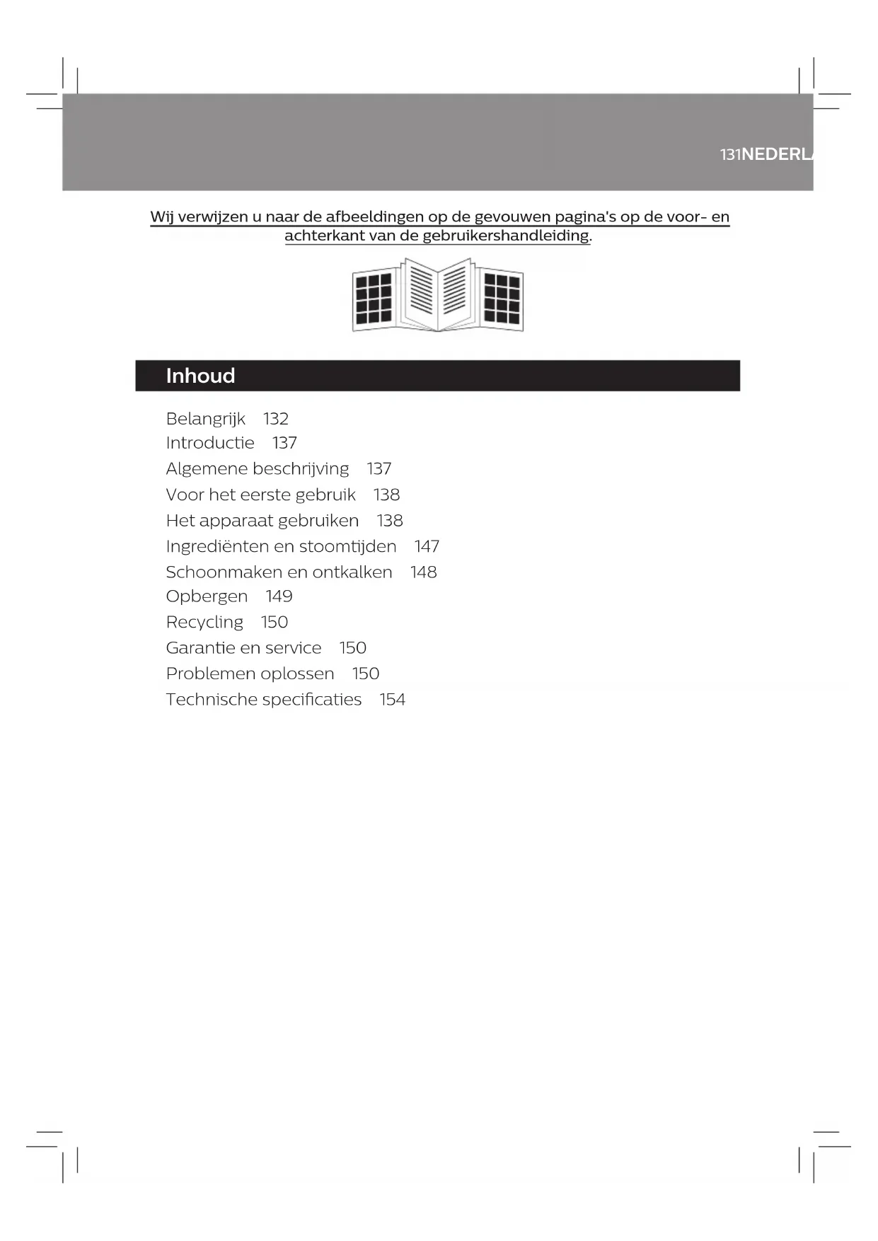 - De stoomtijden kunnen variëren. De geschatte tijden zijn gebaseerd op ingrediënten die allemaal in kleine blokjes zijn gesneden van niet groter dan 1 cm en in totaal niet meer wegen dan 250 gram.148 NEDERLANDS Schoonmaken en ontkalken Reiniging Let op