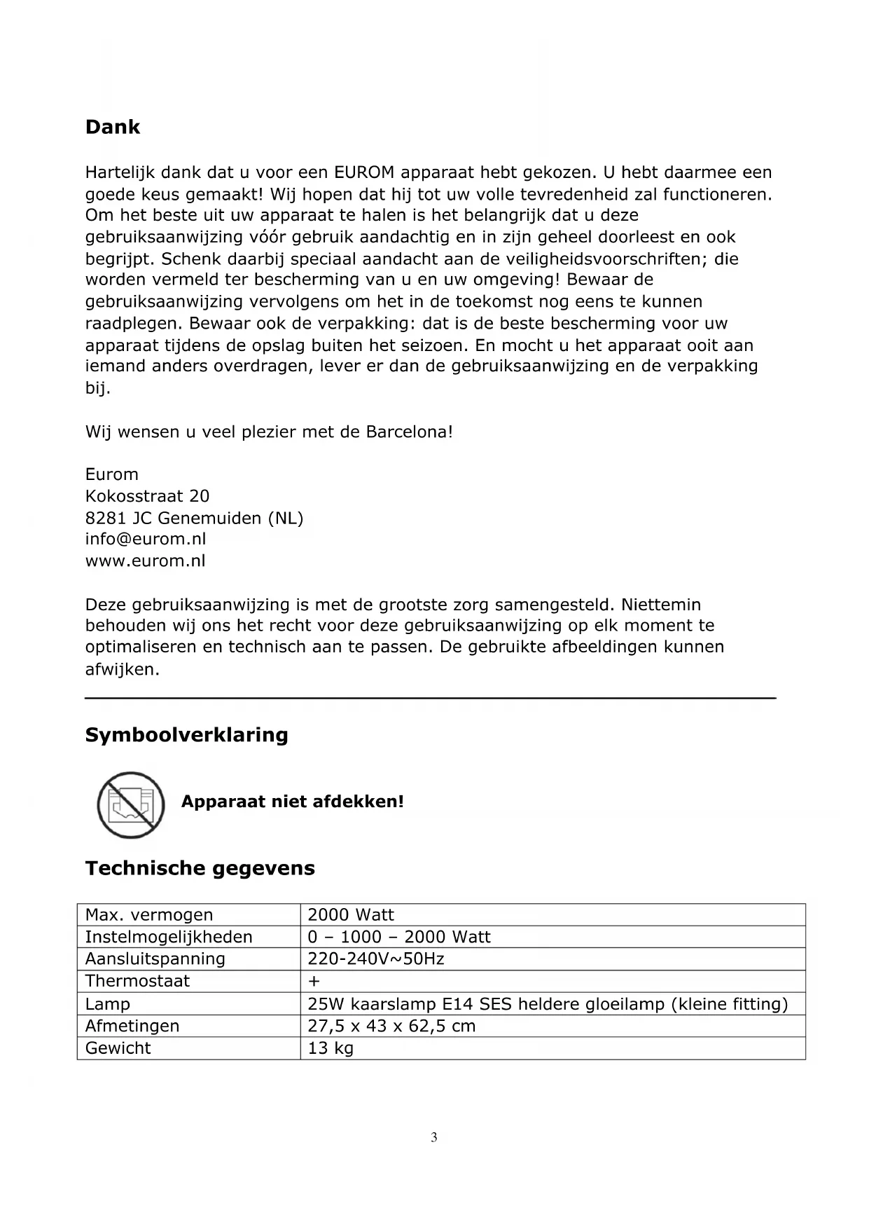 Dank Hartelijk dank dat u voor een EUROM apparaat hebt gekozen. U hebt daarmee een goede keus gemaakt! Wij hopen dat hij tot uw volle tevredenheid zal functioneren. Om het beste uit uw apparaat te halen is het belangrijk dat u deze gebruiksaanwijzing vóór gebruik aandachtig en in zijn geheel doorleest en ook begrijpt. Schenk daarbij speciaal aandacht aan de veiligheidsvoorschriften; die worden vermeld ter bescherming van u en uw omgeving! Bewaar de gebruiksaanwijzing vervolgens om het in de toekomst nog eens te kunnen raadplegen. Bewaar ook de verpakking: dat is de beste bescherming voor uw apparaat tijdens de opslag buiten het seizoen. En mocht u het apparaat ooit aan iemand anders overdragen, lever er dan de gebruiksaanwijzing en de verpakking bij. Wij wensen u veel plezier met de Barcelona! Eurom Kokosstraat 20 8281 JC Genemuiden (NL) info@eurom.nl www.eurom.nl Deze gebruiksaanwijzing is met de grootste zorg samengesteld. Niettemin behouden wij ons het recht voor deze gebruiksaanwijzing op elk moment te optimaliseren en technisch aan te passen. De gebruikte afbeeldingen kunnen afwijken.
