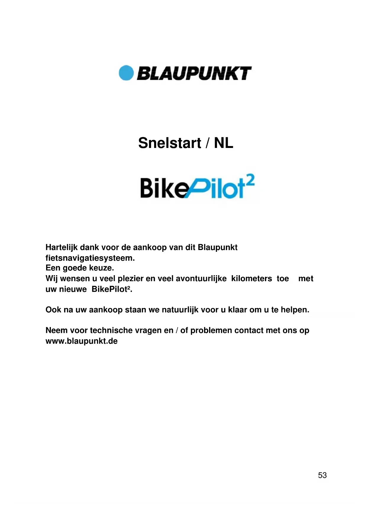 Hartelijk dank voor de aankoop van dit Blaupunkt fietsnavigatiesysteem. Een goede keuze. Wij wensen u veel plezier en veel avontuurlijke kilometers toe met uw nieuwe BikePilot². Ook na uw aankoop staan we natuurlijk voor u klaar om u te helpen. Neem voor technische vragen en / of problemen contact met ons op www.blaupunkt.de54