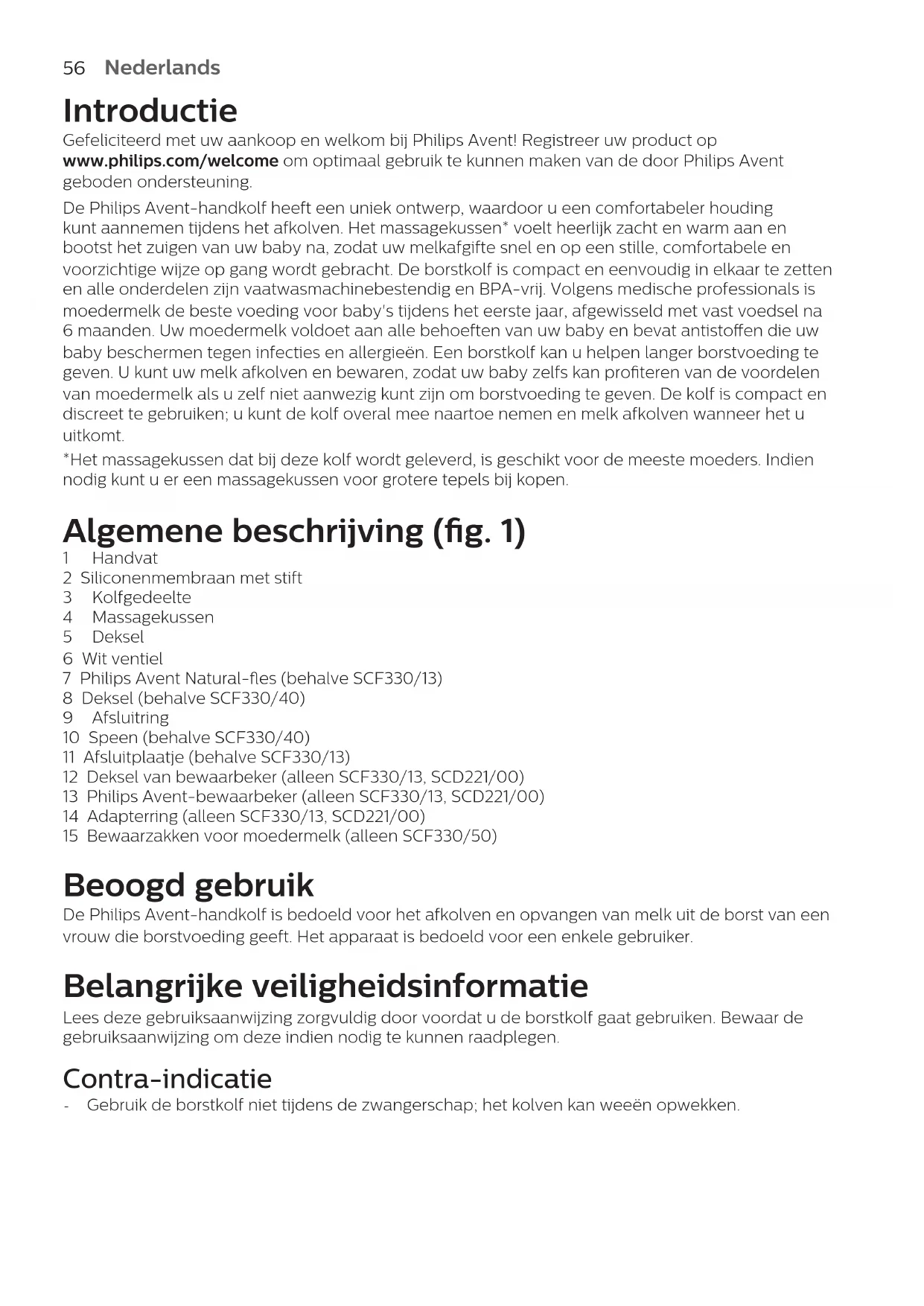 ItalianoIntroductie Gefeliciteerd met uw aankoop en welkom bij Philips Avent! Registreer uw product op www.philips.com/welcome om optimaal gebruik te kunnen maken van de door Philips Avent geboden ondersteuning. De Philips Avent-handkolf heeft een uniek ontwerp, waardoor u een comfortabeler houding kunt aannemen tijdens het afkolven. Het massagekussen* voelt heerlijk zacht en warm aan en bootst het zuigen van uw baby na, zodat uw melkafgifte snel en op een stille, comfortabele en voorzichtige wijze op gang wordt gebracht. De borstkolf is compact en eenvoudig in elkaar te zetten en alle onderdelen zijn vaatwasmachinebestendig en BPA-vrij. Volgens medische professionals is moedermelk de beste voeding voor baby's tijdens het eerste jaar, afgewisseld met vast voedsel na 6 maanden. Uw moedermelk voldoet aan alle behoeften van uw baby en bevat antistoen die uw baby beschermen tegen infecties en allergieën. Een borstkolf kan u helpen langer borstvoeding te geven. U kunt uw melk afkolven en bewaren, zodat uw baby zelfs kan proteren van de voordelen van moedermelk als u zelf niet aanwezig kunt zijn om borstvoeding te geven. De kolf is compact en discreet te gebruiken; u kunt de kolf overal mee naartoe nemen en melk afkolven wanneer het u uitkomt. *Het massagekussen dat bij deze kolf wordt geleverd, is geschikt voor de meeste moeders. Indien nodig kunt u er een massagekussen voor grotere tepels bij kopen. Algemene beschrijving (g. 1) 1 Handvat 2 Siliconenmembraan met stift 3 Kolfgedeelte 4 Massagekussen 5 Deksel 6 Wit ventiel 7 Philips Avent Natural-es (behalve SCF330/13) 8 Deksel (behalve SCF330/40) 9 Afsluitring 10 Speen (behalve SCF330/40) 11 Afsluitplaatje (behalve SCF330/13) 12 Deksel van bewaarbeker (alleen SCF330/13, SCD221/00) 13 Philips Avent-bewaarbeker (alleen SCF330/13, SCD221/00) 14 Adapterring (alleen SCF330/13, SCD221/00) 15 Bewaarzakken voor moedermelk (alleen SCF330/50) Beoogd gebruik De Philips Avent-handkolf is bedoeld voor het afkolven en opvangen van melk uit de borst van een vrouw die borstvoeding geeft. Het apparaat is bedoeld voor een enkele gebruiker. Belangrijke veiligheidsinformatie Lees deze gebruiksaanwijzing zorgvuldig door voordat u de borstkolf gaat gebruiken. Bewaar de gebruiksaanwijzing om deze indien nodig te kunnen raadplegen. Contra-indicatie - Gebruik de borstkolf niet tijdens de zwangerschap; het kolven kan weeën opwekken.