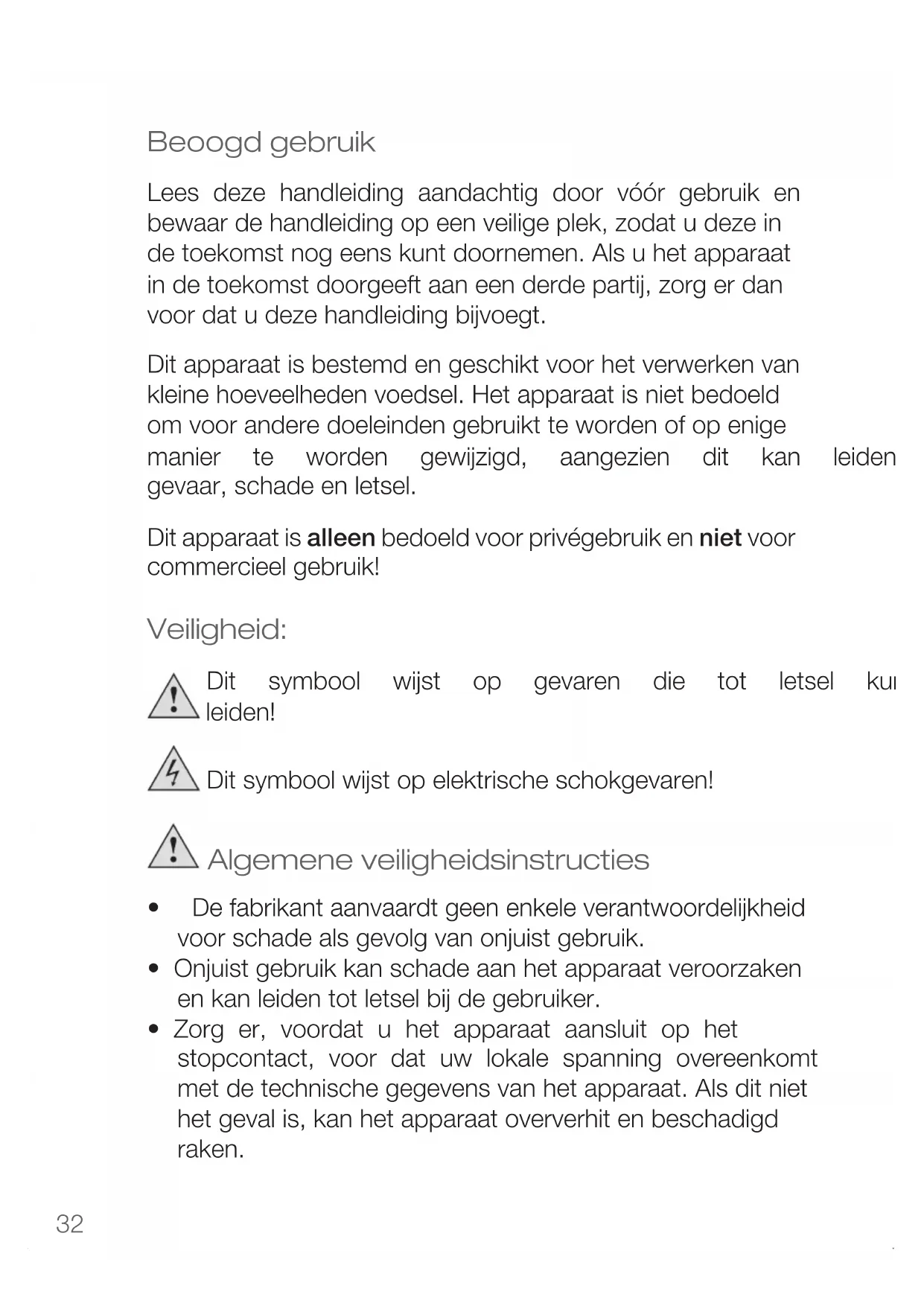 - fordamagescausedbyowner This guarantee does not affect your statutory right, nor any legal right you may have as a costumer under applicable national legislation governing the purchase of goods. Inordertoasserthis/herrightinaguaranteecaseduringthe guaranteed period, the customer must provide evidence of thedateofpurchase(receipt). The guarantee is to be asserted against KORONA electric GmbH, Sundern/Germany. Service Address: KORONA Service, Am Steinbach 9, 59872 Meschede, Germany Telephone Hotline: 02933 90284-80 Mail: service@korona-electric.de web: www.korona-electric.de within 2 years after the date of purchase. In case of guarantee the customer is given the right to get the appliance repaired atourownoratanauthorizedshop.Furtherrights(dueto guaranteecase)arenotgiventothecustomer.32 Beoogd gebruik Lees deze handleiding aandachtig door vóór gebruik en bewaar de handleiding op een veilige plek, zodat u deze in de toekomst nog eens kunt doornemen. Als u het apparaat indetoekomstdoorgeeftaaneenderdepartij,zorgerdan voordatudezehandleidingbijvoegt. Dit apparaat is bestemd en geschikt voor het verwerken van kleine hoeveelheden voedsel. Het apparaat is niet bedoeld om voor andere doeleinden gebruikt te worden of op enige manier te worden gewijzigd, aangezien dit kan leiden tot gevaar, schade en letsel. Dit apparaat is alleen bedoeld voor privégebruik en niet voor commercieel gebruik! Veiligheid: Dit symbool wijst op gevaren die tot letsel kunnen leiden! Ditsymboolwijstopelektrischeschokgevaren! Algemene veiligheidsinstructies