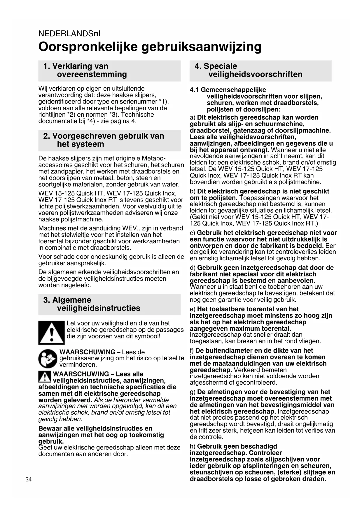 Oorspronkelijke gebruiksaanwijzing Wij verklaren op eigen en uitsluitende verantwoording dat: deze haakse slijpers, geïdentificeerd door type en serienummer *1), voldoen aan alle relevante bepalingen van de richtlijnen *2) en normen *3). Technische documentatie bij *4) - zie pagina 4. De haakse slijpers zijn met originele Metabo- accessoires geschikt voor het schuren, het schuren met zandpapier, het werken met draadborstels en het doorslijpen van metaal, beton, steen en soortgelijke materialen, zonder gebruik van water. WEV 15-125 Quick HT, WEV 17-125 Quick Inox, WEV 17-125 Quick Inox RT is tevens geschikt voor lichte polijstwerkzaamheden. Voor veelvuldig uit te voeren polijstwerkzaamheden adviseren wij onze haakse polijstmachine. Machines met de aanduiding WEV.. zijn in verband met het stelwieltje voor het instellen van het toerental bijzonder geschikt voor werkzaamheden in combinatie met draadborstels. Voor schade door ondeskundig gebruik is alleen de gebruiker aansprakelijk. De algemeen erkende veiligheidsvoorschriften en de bijgevoegde veiligheidsinstructies moeten worden nageleefd. Let voor uw veiligheid en die van het elektrische gereedschap op de passages die zijn voorzien van dit symbool! WAARSCHUWING – Lees de gebruiksaanwijzing om het risico op letsel te verminderen. WAARSCHUWING – Lees alle veiligheidsinstructies, aanwijzingen, afbeeldingen en technische specificaties die samen met dit elektrische gereedschap worden geleverd. Als de hieronder vermelde aanwijzingen niet worden opgevolgd, kan dit een elektrische schok, brand en/of ernstig letsel tot gevolg hebben. Bewaar alle veiligheidsinstructies en aanwijzingen met het oog op toekomstig gebruik. Geef uw elektrische gereedschap alleen met deze documenten aan anderen door.