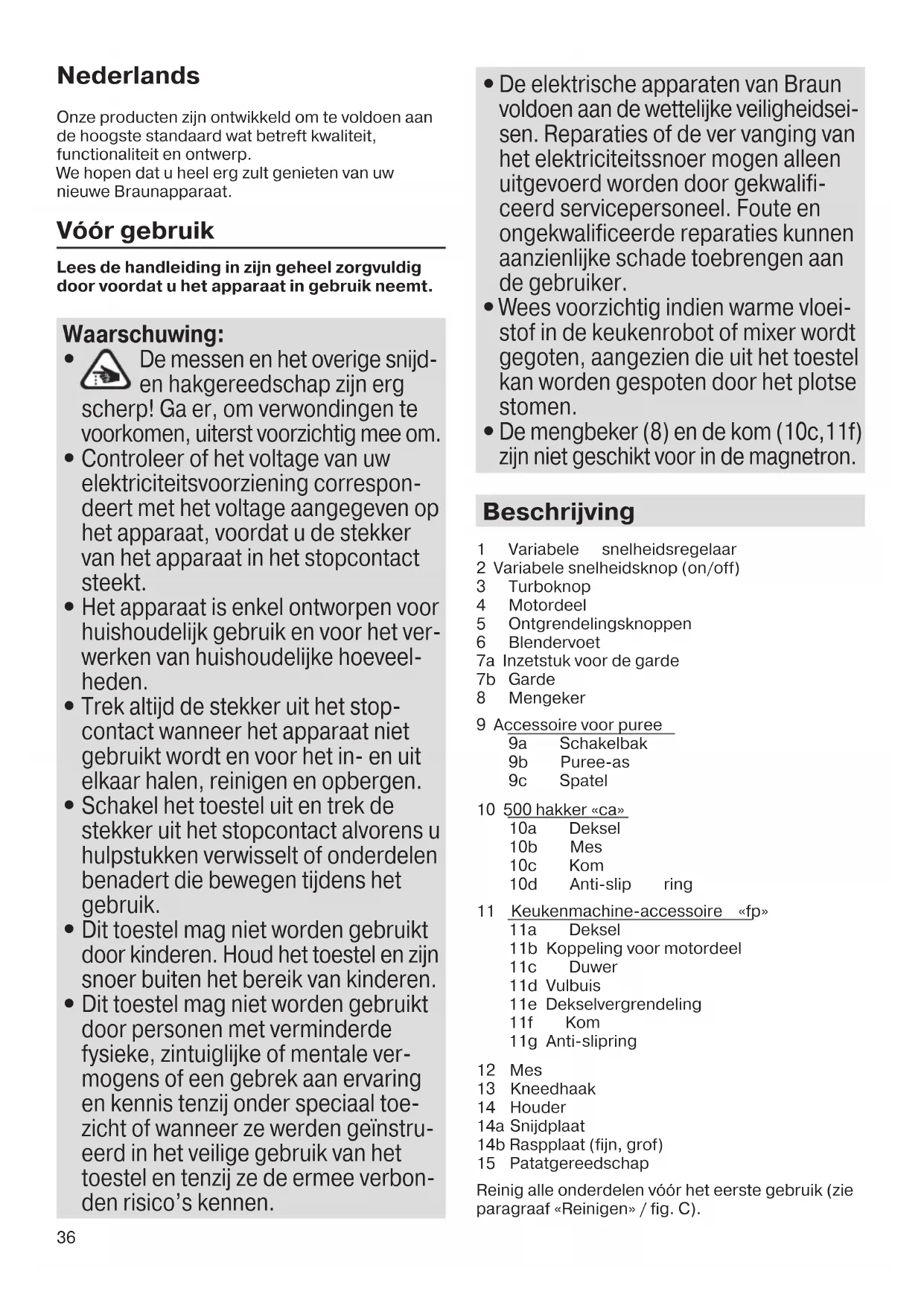 De elektrische apparaten van Braun voldoen aan de wettelijke veiligheidsei- sen. Reparaties of de ver vanging van het elektriciteitssnoer mogen alleen uitgevoerd worden door gekwalifi- ceerd servicepersoneel. Foute en ongekwalificeerde reparaties kunnen aanzienlijke schade toebrengen aan de gebruiker.