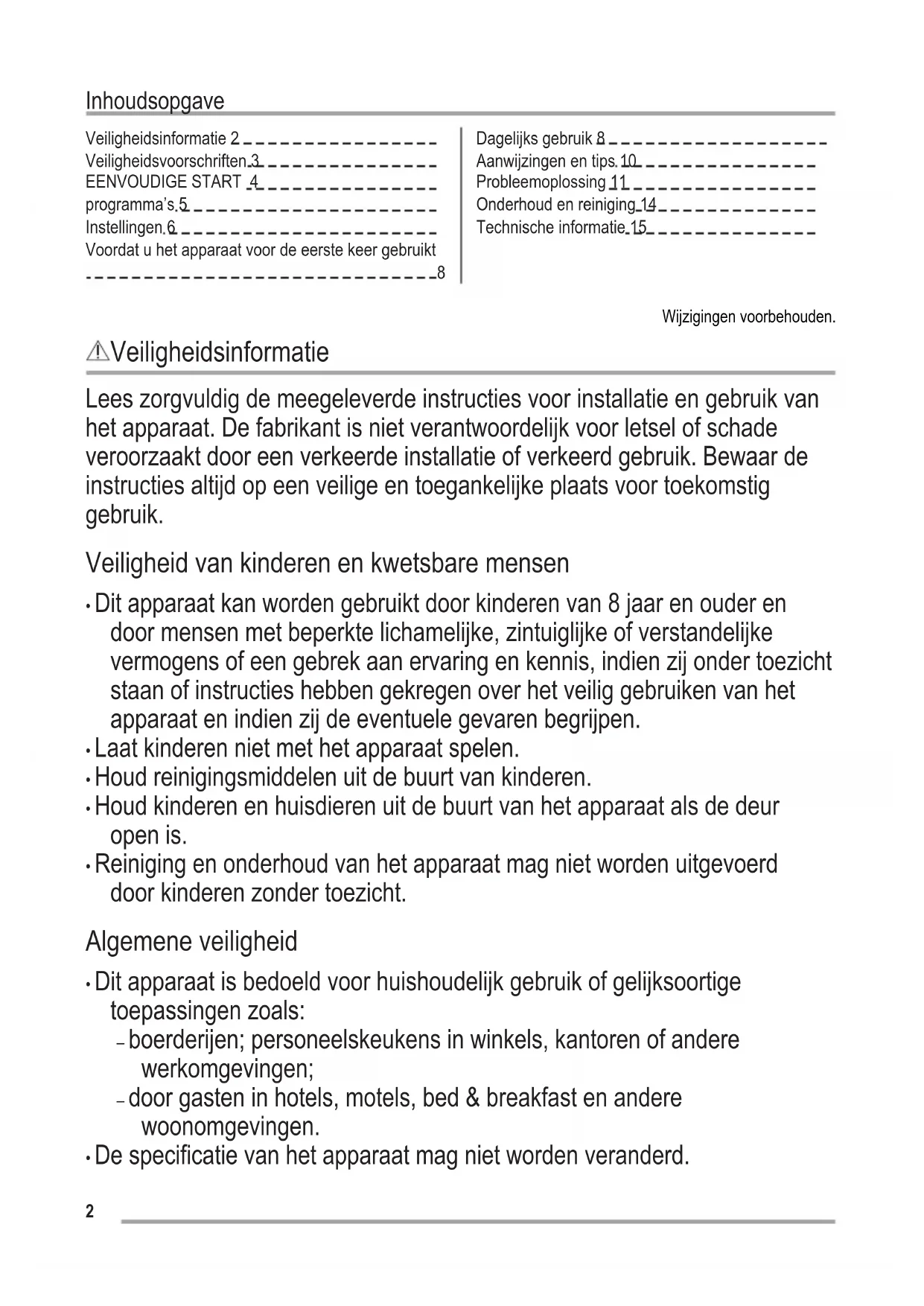 Dagelijks gebruik 8 Aanwijzingen en tips 10 Probleemoplossing 11 Onderhoud en reiniging 14 Technische informatie 15 Wijzigingen voorbehouden. Veiligheidsinformatie Lees zorgvuldig de meegeleverde instructies voor installatie en gebruik van het apparaat. De fabrikant is niet verantwoordelijk voor letsel of schade veroorzaakt door een verkeerde installatie of verkeerd gebruik. Bewaar de instructies altijd op een veilige en toegankelijke plaats voor toekomstig gebruik. Veiligheid van kinderen en kwetsbare mensen