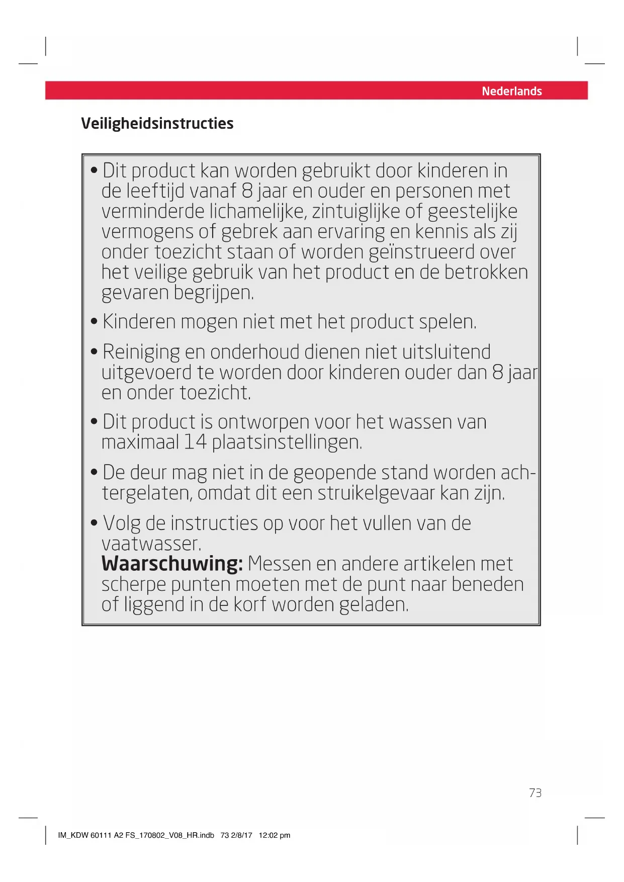 - Volg de instructies op voor het vullen van de vaatwasser. Waarschuwing: Messen en andere artikelen met scherpe punten moeten met de punt naar beneden of liggend in de korf worden geladen. IM_KDW 60111 A2 FS_170802_V08_HR.indb 73 2/8/17 12:02 pmNederlands
