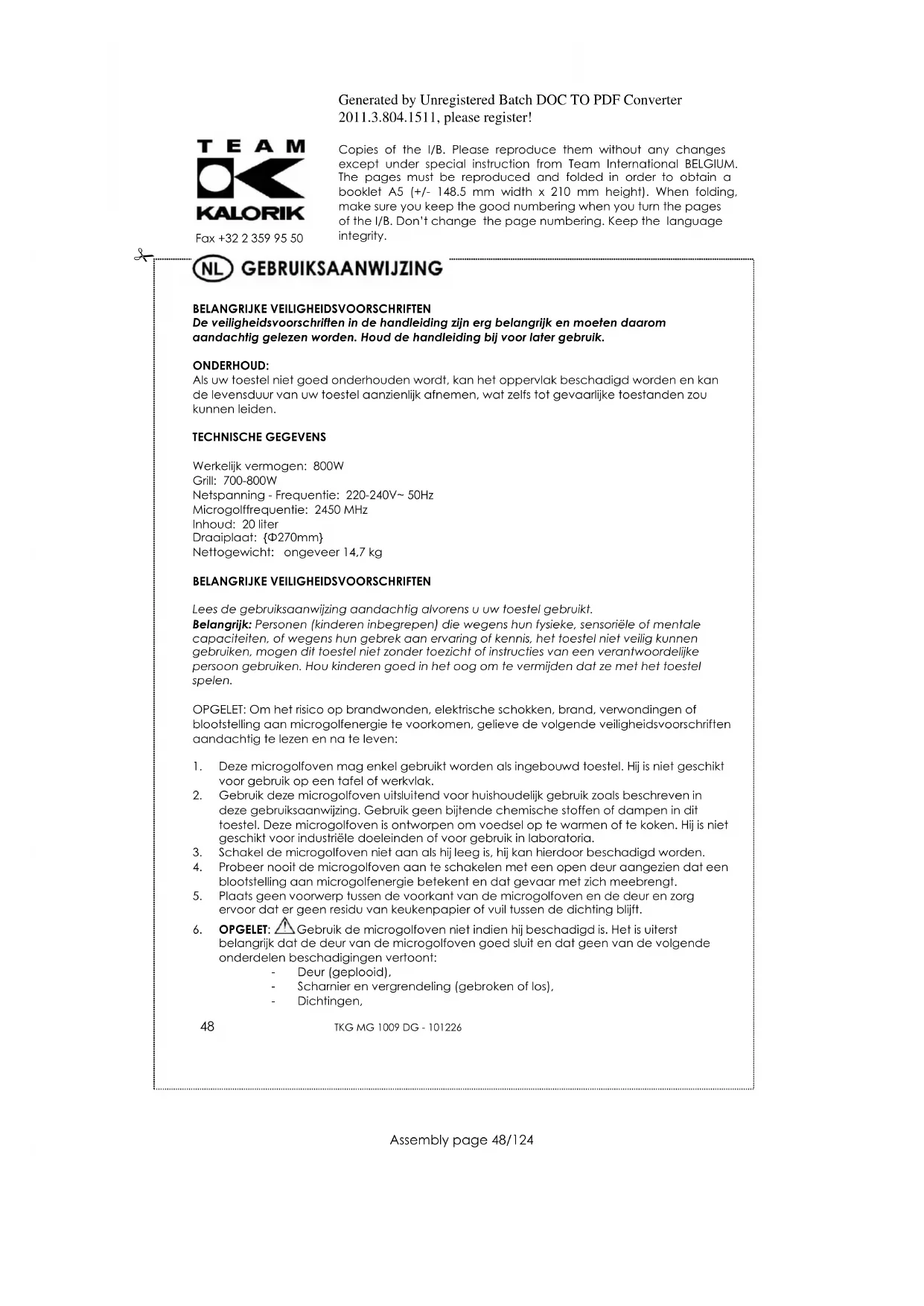 deur met een zachte doek. Dampvorming kan ontstaan als de microgolfoven in werking is onder vochtige omstandigheden; dit wijst echter in geen geval op een niet goed functioneren van het apparaat.Generated by Unregistered Batch DOC TO PDF Converter 2011.3.804.1511, please register! Copies of the I/B. Please reproduce them without any changes except under special instruction from Team International BELGIUM. The pages must be reproduced and folded in order to obtain a booklet A5 (+/- 148.5 mm width x 210 mm height). When folding, make sure you keep the good numbering when you turn the pages of the I/B. Don’t change the page numbering. Keep the language integrity.