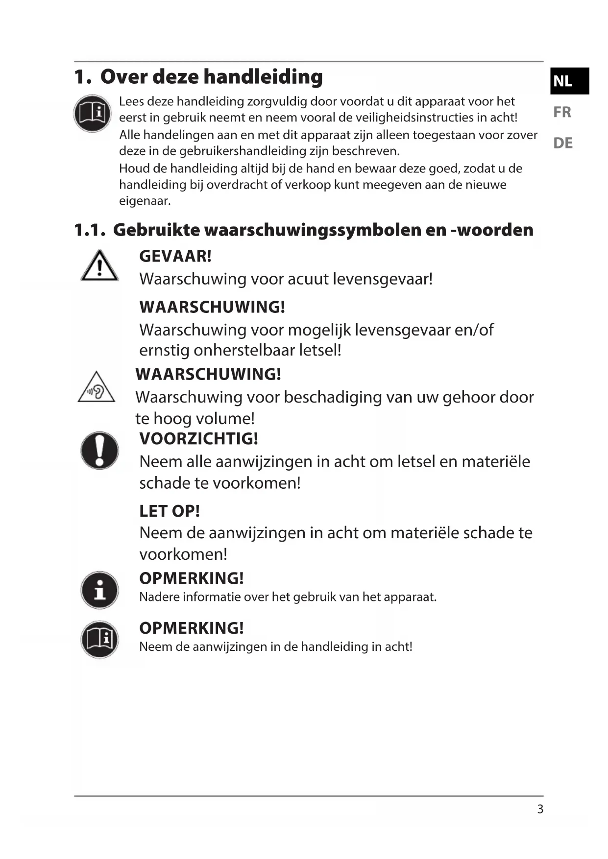 Lees deze handleiding zorgvuldig door voordat u dit apparaat voor het eerst in gebruik neemt en neem vooral de veiligheidsinstructies in acht! Alle handelingen aan en met dit apparaat zijn alleen toegestaan voor zover deze in de gebruikershandleiding zijn beschreven. Houd de handleiding altijd bij de hand en bewaar deze goed, zodat u de handleiding bij overdracht of verkoop kunt meegeven aan de nieuwe eigenaar. 1.1. Gebruikte waarschuwingssymbolen en -woorden GEVAAR! Waarschuwing voor acuut levensgevaar! WAARSCHUWING! Waarschuwing voor mogelijk levensgevaar en/of ernstig onherstelbaar letsel! WAARSCHUWING! Waarschuwing voor beschadiging van uw gehoor door te hoog volume! VOORZICHTIG! Neem alle aanwijzingen in acht om letsel en materiële schade te voorkomen! LET OP! Neem de aanwijzingen in acht om materiële schade te voorkomen! OPMERKING! Nadere informatie over het gebruik van het apparaat. OPMERKING! Neem de aanwijzingen in de handleiding in acht! 43292 ML Content ML Final.indb 343292 ML Content ML Final.indb 3 23.08.2016 09:31:5823.08.2016 09:31:584
