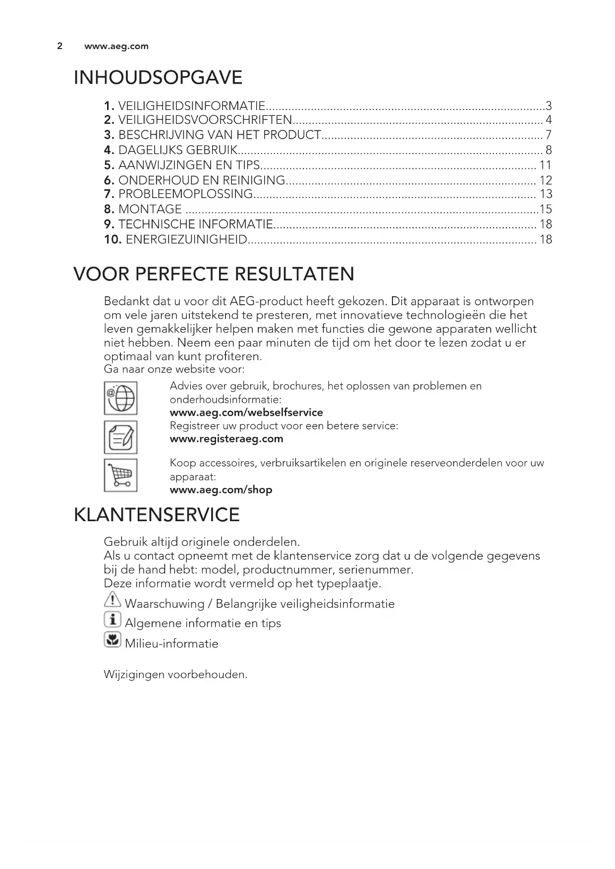 Bedankt dat u voor dit AEG-product heeft gekozen. Dit apparaat is ontworpen om vele jaren uitstekend te presteren, met innovatieve technologieën die het leven gemakkelijker helpen maken met functies die gewone apparaten wellicht niet hebben. Neem een paar minuten de tijd om het door te lezen zodat u er optimaal van kunt profiteren. Ga naar onze website voor: Advies over gebruik, brochures, het oplossen van problemen en onderhoudsinformatie: www.aeg.com/webselfservice Registreer uw product voor een betere service: www.registeraeg.com Koop accessoires, verbruiksartikelen en originele reserveonderdelen voor uw apparaat: www.aeg.com/shop KLANTENSERVICE Gebruik altijd originele onderdelen. Als u contact opneemt met de klantenservice zorg dat u de volgende gegevens bij de hand hebt: model, productnummer, serienummer. Deze informatie wordt vermeld op het typeplaatje. Waarschuwing / Belangrijke veiligheidsinformatie Algemene informatie en tips Milieu-informatie Wijzigingen voorbehouden. www.aeg.com