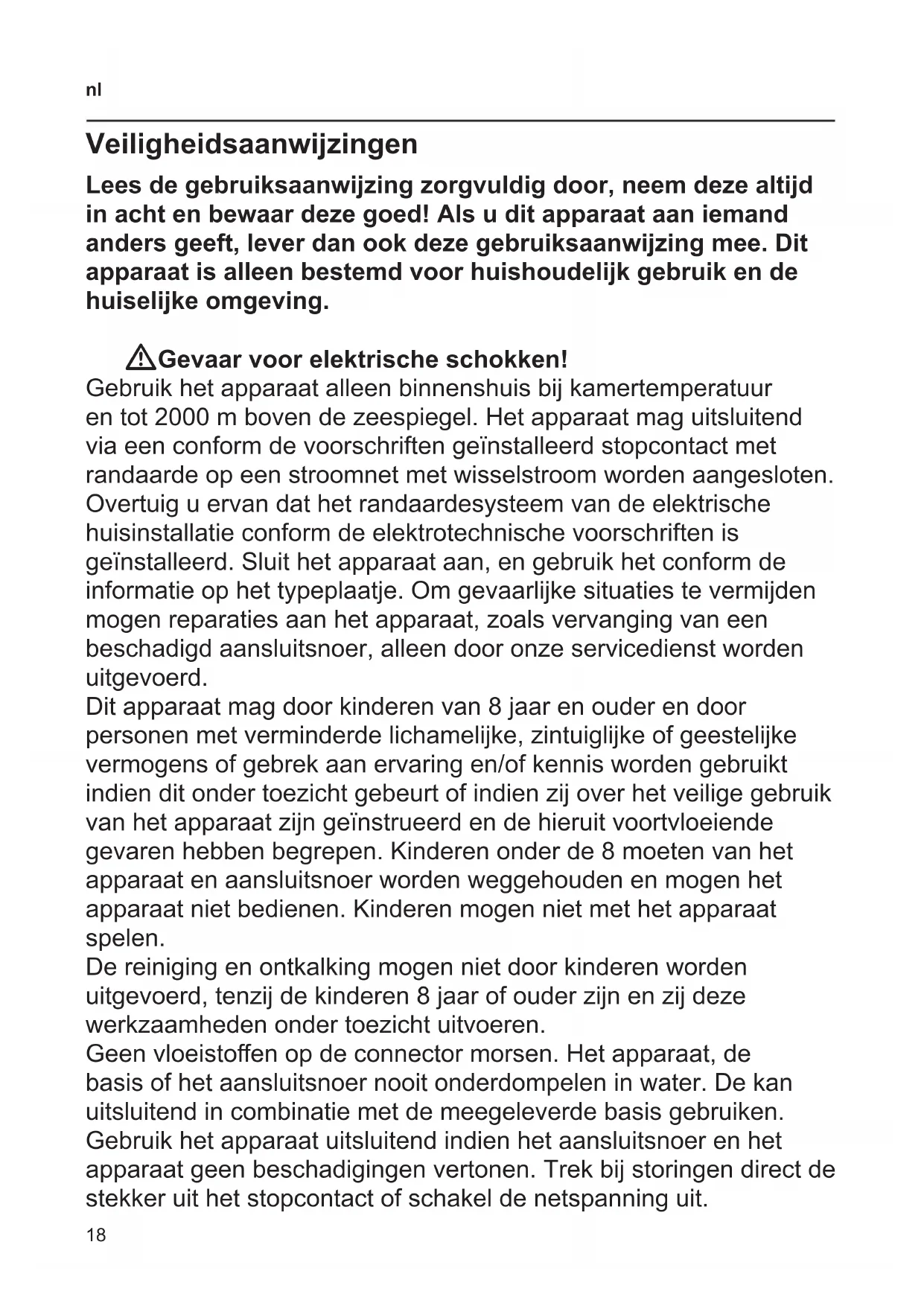 Veiligheidsaanwijzingen Lees de gebruiksaanwijzing zorgvuldig door, neem deze altijd in acht en bewaar deze goed! Als u dit apparaat aan iemand anders geeft, lever dan ook deze gebruiksaanwijzing mee. Dit apparaat is alleen bestemd voor huishoudelijk gebruik en de huiselijke omgeving. WGevaar voor elektrische schokken! Gebruik het apparaat alleen binnenshuis bij kamertemperatuur en tot 2000 m boven de zeespiegel. Het apparaat mag uitsluitend via een conform de voorschriften geïnstalleerd stopcontact met randaarde op een stroomnet met wisselstroom worden aangesloten. Overtuig u ervan dat het randaardesysteem van de elektrische huisinstallatie conform de elektrotechnische voorschriften is geïnstalleerd. Sluit het apparaat aan, en gebruik het conform de informatie op het typeplaatje. Om gevaarlijke situaties te vermijden mogen reparaties aan het apparaat, zoals vervanging van een beschadigd aansluitsnoer, alleen door onze servicedienst worden uitgevoerd. Dit apparaat mag door kinderen van 8 jaar en ouder en door personen met verminderde lichamelijke, zintuiglijke of geestelijke vermogens of gebrek aan ervaring en/of kennis worden gebruikt indien dit onder toezicht gebeurt of indien zij over het veilige gebruik van het apparaat zijn geïnstrueerd en de hieruit voortvloeiende gevaren hebben begrepen. Kinderen onder de 8 moeten van het apparaat en aansluitsnoer worden weggehouden en mogen het apparaat niet bedienen. Kinderen mogen niet met het apparaat spelen. De reiniging en ontkalking mogen niet door kinderen worden uitgevoerd, tenzij de kinderen 8 jaar of ouder zijn en zij deze werkzaamheden onder toezicht uitvoeren. Geen vloeistoen op de connector morsen. Het apparaat, de basis of het aansluitsnoer nooit onderdompelen in water. De kan uitsluitend in combinatie met de meegeleverde basis gebruiken. Gebruik het apparaat uitsluitend indien het aansluitsnoer en het apparaat geen beschadigingen vertonen. Trek bij storingen direct de stekker uit het stopcontact of schakel de netspanning uit.19