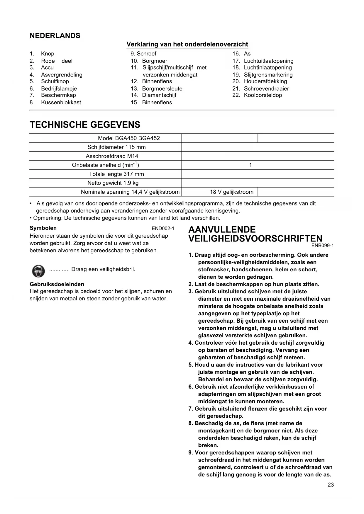 - Opmerking: De technische gegevens kunnen van land tot land verschillen. Symbolen END002-1 Hieronder staan de symbolen die voor dit gereedschap worden gebruikt. Zorg ervoor dat u weet wat ze betekenen alvorens het gereedschap te gebruiken. ............. Draag een veiligheidsbril. Gebruiksdoeleinden Het gereedschap is bedoeld voor het slijpen, schuren en snijden van metaal en steen zonder gebruik van water. AANVULLENDE VEILIGHEIDSVOORSCHRIFTEN ENB099-1