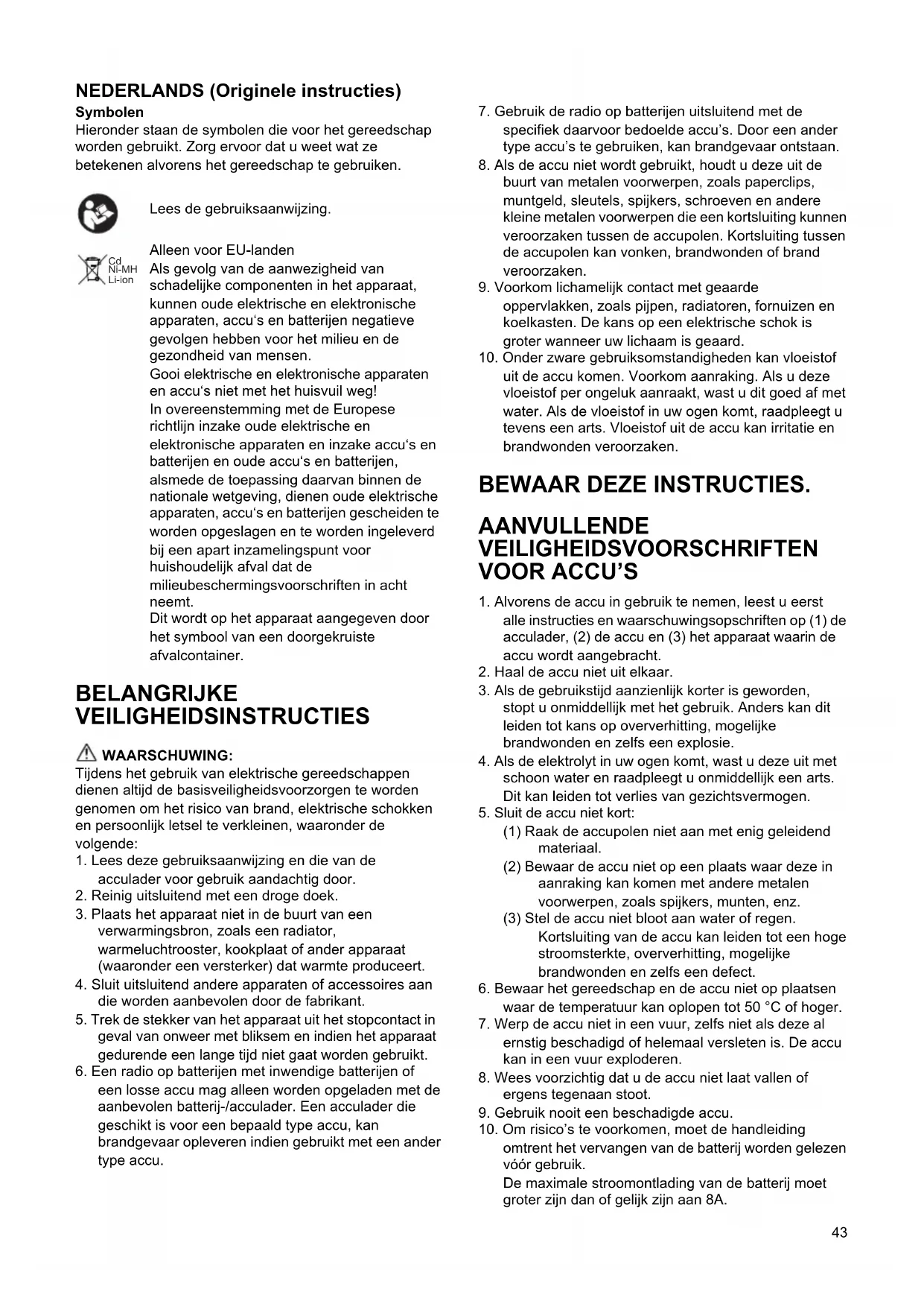 omtrent het vervangen van de batterij worden gelezen vóór gebruik. De maximale stroomontlading van de batterij moet groter zijn dan of gelijk zijn aan 8A. Lees de gebruiksaanwijzing. Alleen voor EU-landen Als gevolg van de aanwezigheid van schadelijke componenten in het apparaat, kunnen oude elektrische en elektronische apparaten, accu‘s en batterijen negatieve gevolgen hebben voor het milieu en de gezondheid van mensen. Gooi elektrische en elektronische apparaten en accu‘s niet met het huisvuil weg! In overeenstemming met de Europese richtlijn inzake oude elektrische en elektronische apparaten en inzake accu‘s en batterijen en oude accu‘s en batterijen, alsmede de toepassing daarvan binnen de nationale wetgeving, dienen oude elektrische apparaten, accu‘s en batterijen gescheiden te worden opgeslagen en te worden ingeleverd bij een apart inzamelingspunt voor huishoudelijk afval dat de milieubeschermingsvoorschriften in acht neemt. Dit wordt op het apparaat aangegeven door het symbool van een doorgekruiste afvalcontainer.