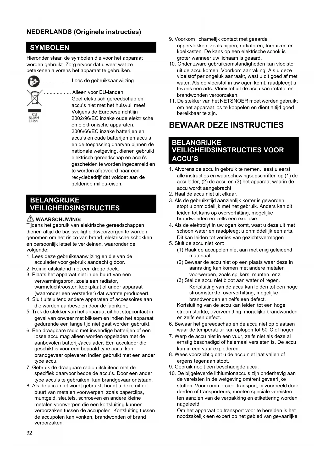 - Evitare assolutamente di usare benzina, diluenti, solventi, alcol o sostanze simili. In caso contrario, potrebbero verificarsi scoloriture, deformazioni o incrinature. Requisiti di alimentazione Alimentatore CA 12 V CC, 1 A, pin centrale positivo Batteria Batteria a cluster: 7,2 V - 10,8 V Batteria a scorrimento: 10,8 V - 18 V Copertura di frequenza FM 87,50 - 108 MHz DAB/DAB+ 174,928 - 239,200 MHz Blocco canali DAB/DAB+ DAB (Band III) 5A-13F Standard compatibile DAB (DMR109) DAB/DAB+ (DMR110) Caratteristiche del circuito Altoparlante 3 pollici, 8 ohm Potenza in uscita 7,2 V: 0,5 W × 2 10,8 V:1,2 W × 2 14,4 V: 2,2 W × 2 18 V: 3,5 W × 2 Terminale d’ingresso 3,5 mm diam. (AUX IN 1/AUX IN 2) Sistema dell’antenna DAB/FM: antenna a stelo morbida Dimensioni (lu × la × al) 280 × 163 × 302 Peso 4,0 kg (senza batteria) MANUTENZIONE SPECIFICHE32 NEDERLANDS (Originele instructies) Hieronder staan de symbolen die voor het apparaat worden gebruikt. Zorg ervoor dat u weet wat ze betekenen alvorens het apparaat te gebruiken. .................... Lees de gebruiksaanwijzing. ................... Alleen voor EU-landen Geef elektrisch gereedschap en accu’s niet met het huisvuil mee! Volgens de Europese richtlijn 2002/96/EC inzake oude elektrische en elektronische apparaten, 2006/66/EC inzake batterijen en accu’s en oude batterijen en accu’s en de toepassing daarvan binnen de nationale wetgeving, dienen gebruikt elektrisch gereedschap en accu’s gescheiden te worden ingezameld en te worden afgevoerd naar een recyclebedrijf dat voldoet aan de geldende milieu-eisen. WAARSCHUWING: Tijdens het gebruik van elektrische gereedschappen dienen altijd de basisveiligheidsvoorzorgen te worden genomen om het risico van brand, elektrische schokken en persoonlijk letsel te verkleinen, waaronder de volgende: