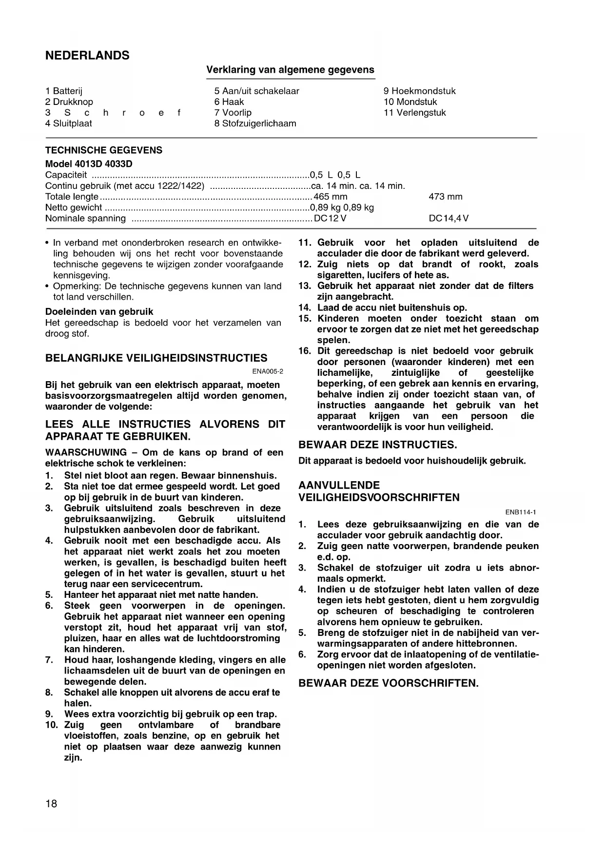 - Gebruik uitsluitend zoals beschreiben in deze gebruiksaanwijzing. Gebruik uitsluitend hulpstukken aanbevolen door de fabrikant.