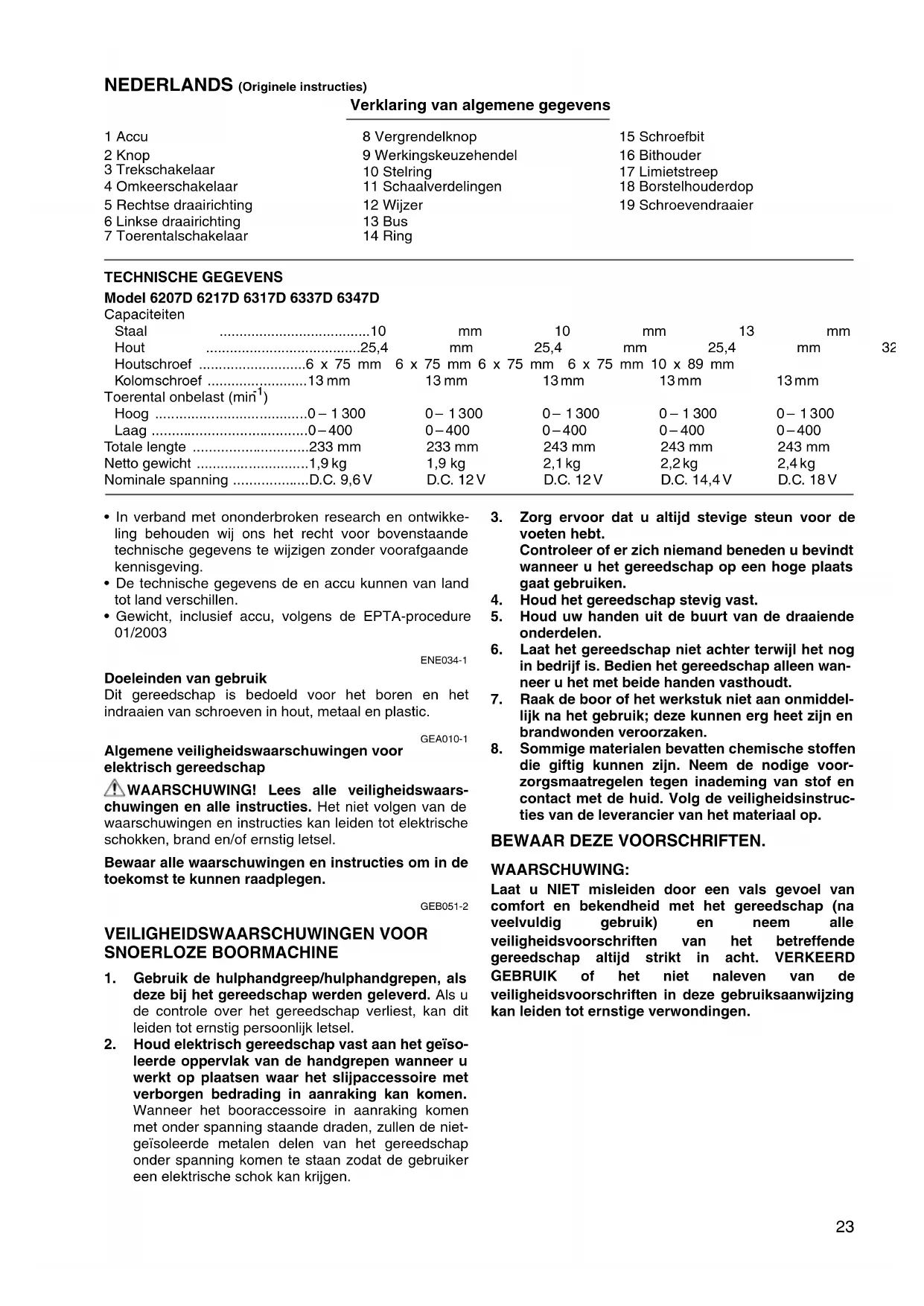 die giftig kunnen zijn. Neem de nodige voor- zorgsmaatregelen tegen inademing van stof en contact met de huid. Volg de veiligheidsinstruc- ties van de leverancier van het materiaal op. BEWAAR DEZE VOORSCHRIFTEN. WAARSCHUWING: Laat u NIET misleiden door een vals gevoel van comfort en bekendheid met het gereedschap (na veelvuldig gebruik) en neem alle veiligheidsvoorschriften van het betreffende gereedschap altijd strikt in acht. VERKEERD GEBRUIK of het niet naleven van de veiligheidsvoorschriften in deze gebruiksaanwijzing kan leiden tot ernstige verwondingen.24 ENC004-2 BELANGRIJKE VEILIGHEIDSVOORSCHRIFTEN VOOR ACCU