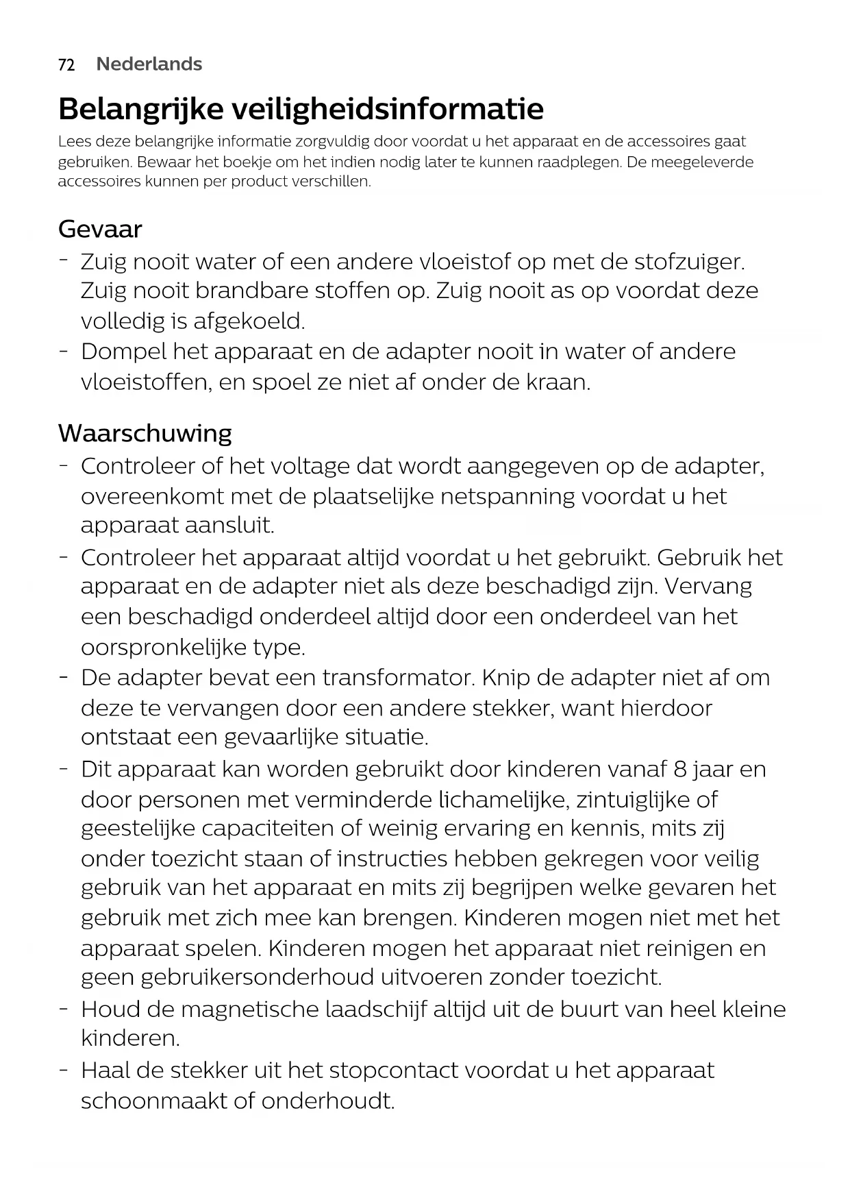 Zuig nooit water of een andere vloeistof op met de stofzuiger. Zuig nooit brandbare stoffen op. Zuig nooit as op voordat deze volledig is afgekoeld.