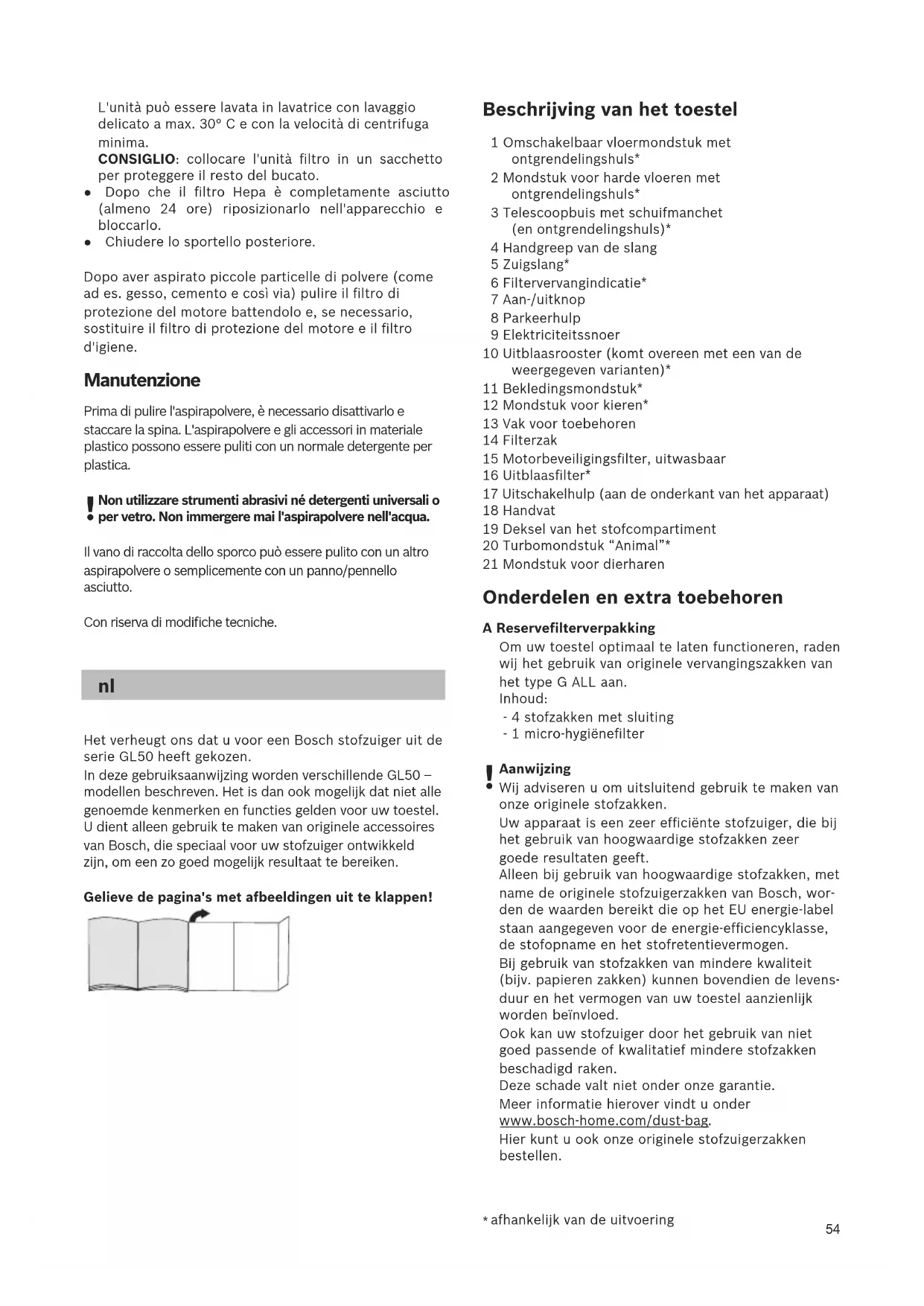 Het verheugt ons dat u voor een Bosch stofzuiger uit de serie GL50 heeft gekozen. In deze gebruiksaanwijzing worden verschillende GL50 – modellen beschreven. Het is dan ook mogelijk dat niet alle genoemde kenmerken en functies gelden voor uw toestel. U dient alleen gebruik te maken van originele accessoires van Bosch, die speciaal voor uw stofzuiger ontwikkeld zijn, om een zo goed mogelijk resultaat te bereiken. Gelieve de pagina's met afbeeldingen uit te klappen! Beschrijving van het toestel 1 Omschakelbaar vloermondstuk met ontgrendelingshuls* 2 Mondstuk voor harde vloeren met ontgrendelingshuls* 3 Telescoopbuis met schuifmanchet (en ontgrendelingshuls)* 4 Handgreep van de slang 5 Zuigslang* 6 Filtervervangindicatie* 7 Aan-/uitknop 8 Parkeerhulp 9 Elektriciteitssnoer 10 Uitblaasrooster (komt overeen met een van de weergegeven varianten)* 11 Bekledingsmondstuk* 12 Mondstuk voor kieren* 13 Vak voor toebehoren 14 Filterzak 15 Motorbeveiligingsfilter, uitwasbaar 16 Uitblaasfilter* 17 Uitschakelhulp (aan de onderkant van het apparaat) 18 Handvat 19 Deksel van het stofcompartiment 20 Turbomondstuk “Animal”* 21 Mondstuk voor dierharen Onderdelen en extra toebehoren A Reservefilterverpakking Om uw toestel optimaal te laten functioneren, raden wij het gebruik van originele vervangingszakken van het type G ALL aan. Inhoud: - 4 stofzakken met sluiting - 1 micro-hygiënefilter