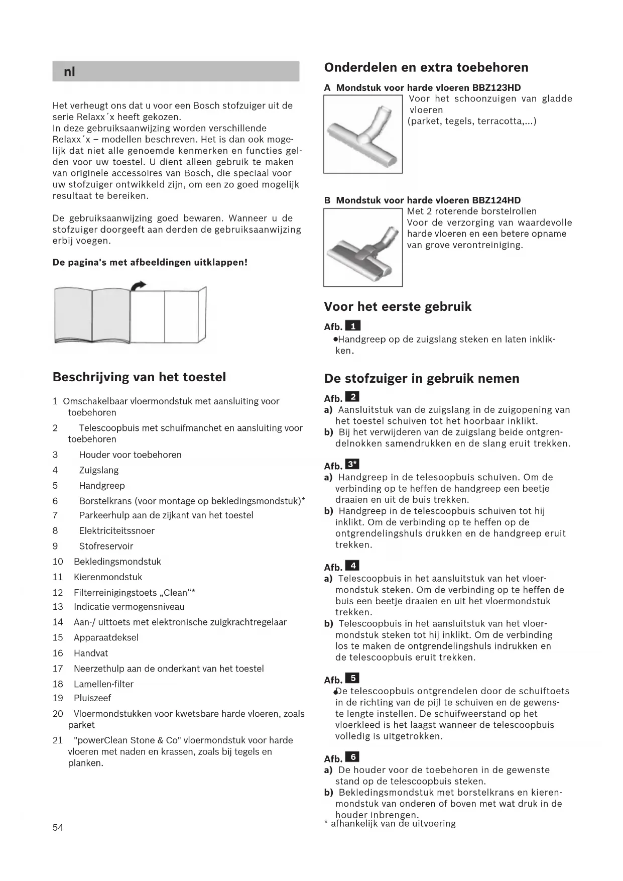 Attenzione: Non utilizzare detergenti abrasi- vi, universali o per vetro. Non immergere mai l'aspirapolvere nell'acqua. Con riserva di modifiche tecniche.54 Het verheugt ons dat u voor een Bosch stofzuiger uit de serie Relaxx´x heeft gekozen. In deze gebruiksaanwijzing worden verschillende Relaxx´x – modellen beschreven. Het is dan ook moge- lijk dat niet alle genoemde kenmerken en functies gel- den voor uw toestel. U dient alleen gebruik te maken van originele accessoires van Bosch, die speciaal voor uw stofzuiger ontwikkeld zijn, om een zo goed mogelijk resultaat te bereiken. De gebruiksaanwijzing goed bewaren. Wanneer u de stofzuiger doorgeeft aan derden de gebruiksaanwijzing erbij voegen. De pagina's met afbeeldingen uitklappen! Beschrijving van het toestel 1 Omschakelbaar vloermondstuk met aansluiting voor toebehoren 2 Telescoopbuis met schuifmanchet en aansluiting voor toebehoren 3 Houder voor toebehoren 4 Zuigslang 5 Handgreep 6 Borstelkrans (voor montage op bekledingsmondstuk)* 7 Parkeerhulp aan de zijkant van het toestel 8 Elektriciteitssnoer 9 Stofreservoir 10 Bekledingsmondstuk 11 Kierenmondstuk 12 Filterreinigingstoets „Clean“* 13 Indicatie vermogensniveau 14 Aan-/ uittoets met elektronische zuigkrachtregelaar 15 Apparaatdeksel 16 Handvat 17 Neerzethulp aan de onderkant van het toestel 18 Lamellen-filter 19 Pluiszeef 20 Vloermondstukken voor kwetsbare harde vloeren, zoals parket 21 "powerClean Stone & Co" vloermondstuk voor harde vloeren met naden en krassen, zoals bij tegels en planken. Onderdelen en extra toebehoren A Mondstuk voor harde vloeren BBZ123HD Voor het schoonzuigen van gladde vloeren (parket, tegels, terracotta,...) B Mondstuk voor harde vloeren BBZ124HD Met 2 roterende borstelrollen Voor de verzorging van waardevolle harde vloeren en een betere opname van grove verontreiniging. Voor het eerste gebruik Afb.