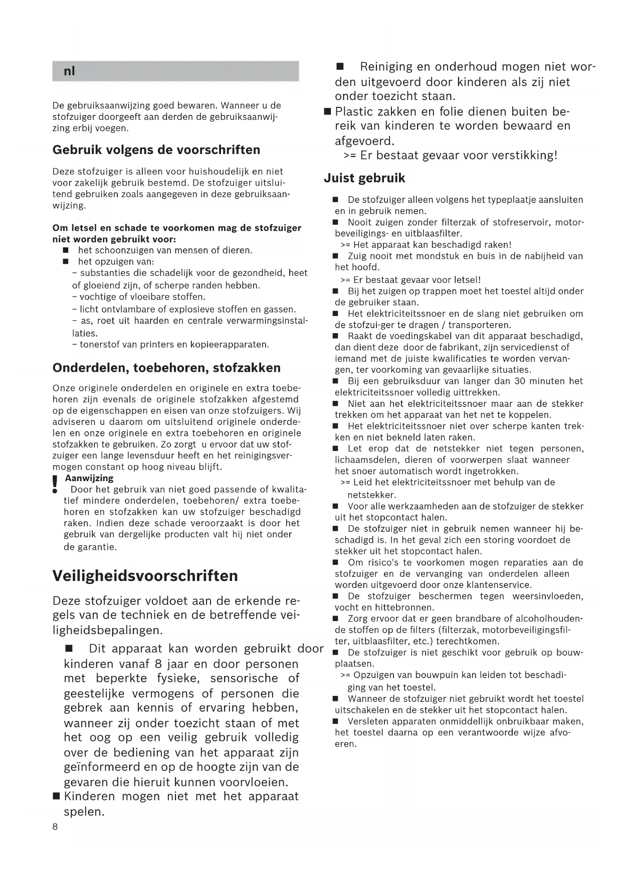 Aanwijzing Door het gebruik van niet goed passende of kwalita- tief mindere onderdelen, toebehoren/ extra toebe- horen en stofzakken kan uw stofzuiger beschadigd raken. Indien deze schade veroorzaakt is door het gebruik van dergelijke producten valt hij niet onder de garantie. Veiligheidsvoorschriften Deze stofzuiger voldoet aan de erkende re- gels van de techniek en de betreffende vei- ligheidsbepalingen. Dit apparaat kan worden gebruikt door kinderen vanaf 8 jaar en door personen met beperkte fysieke, sensorische of geestelijke vermogens of personen die gebrek aan kennis of ervaring hebben, wanneer zij onder toezicht staan of met het oog op een veilig gebruik volledig over de bediening van het apparaat zijn geïnformeerd en op de hoogte zijn van de gevaren die hieruit kunnen voorvloeien. Kinderen mogen niet met het apparaat spelen. Reiniging en onderhoud mogen niet wor- den uitgevoerd door kinderen als zij niet onder toezicht staan. Plastic zakken en folie dienen buiten be- reik van kinderen te worden bewaard en afgevoerd. >= Er bestaat gevaar voor verstikking! Juist gebruik De stofzuiger alleen volgens het typeplaatje aansluiten en in gebruik nemen. Nooit zuigen zonder filterzak of stofreservoir, motor- beveiligings- en uitblaasfilter. >= Het apparaat kan beschadigd raken! Zuig nooit met mondstuk en buis in de nabijheid van het hoofd. >= Er bestaat gevaar voor letsel! Bij het zuigen op trappen moet het toestel altijd onder de gebruiker staan. Het elektriciteitssnoer en de slang niet gebruiken om de stofzui-ger te dragen / transporteren. Raakt de voedingskabel van dit apparaat beschadigd, dan dient deze door de fabrikant, zijn servicedienst of iemand met de juiste kwalificaties te worden vervan- gen, ter voorkoming van gevaarlijke situaties. Bij een gebruiksduur van langer dan 30 minuten het elektriciteitssnoer volledig uittrekken. Niet aan het elektriciteitssnoer maar aan de stekker trekken om het apparaat van het net te koppelen. Het elektriciteitssnoer niet over scherpe kanten trek- ken en niet bekneld laten raken. Let erop dat de netstekker niet tegen personen, lichaamsdelen, dieren of voorwerpen slaat wanneer het snoer automatisch wordt ingetrokken. >= Leid het elektriciteitssnoer met behulp van de netstekker. Voor alle werkzaamheden aan de stofzuiger de stekker uit het stopcontact halen. De stofzuiger niet in gebruik nemen wanneer hij be- schadigd is. In het geval zich een storing voordoet de stekker uit het stopcontact halen. Om risico's te voorkomen mogen reparaties aan de stofzuiger en de vervanging van onderdelen alleen worden uitgevoerd door onze klantenservice. De stofzuiger beschermen tegen weersinvloeden, vocht en hittebronnen. Zorg ervoor dat er geen brandbare of alcoholhouden- de stoffen op de filters (filterzak, motorbeveiligingsfil- ter, uitblaasfilter, etc.) terechtkomen. De stofzuiger is niet geschikt voor gebruik op bouw- plaatsen. >= Opzuigen van bouwpuin kan leiden tot beschadi- ging van het toestel. Wanneer de stofzuiger niet gebruikt wordt het toestel uitschakelen en de stekker uit het stopcontact halen. Versleten apparaten onmiddellijk onbruikbaar maken, het toestel daarna op een verantwoorde wijze afvo- eren. nl9