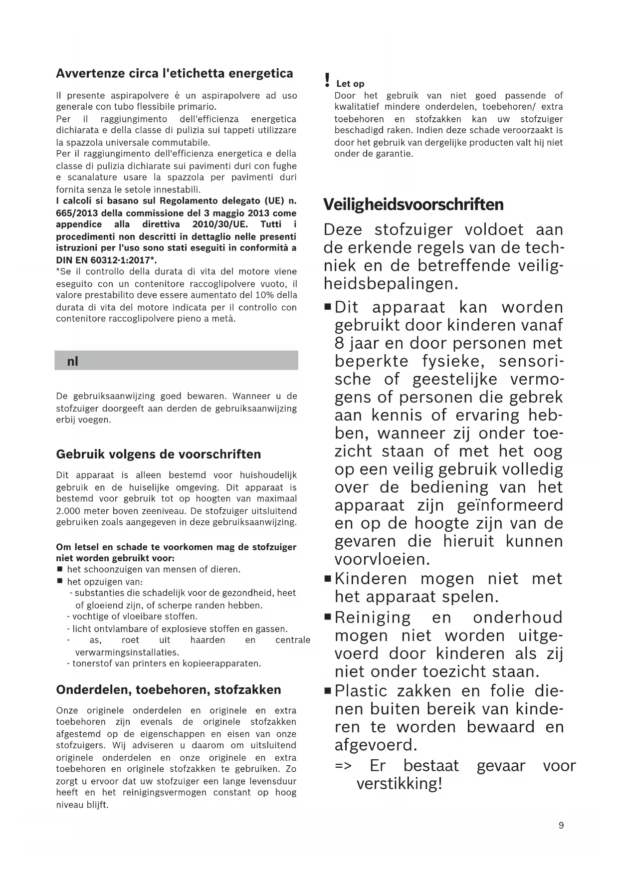 gebruiken zoals aangegeven in deze gebruiksaanwijzing. Om letsel en schade te voorkomen mag de stofzuiger niet worden gebruikt voor: het schoonzuigen van mensen of dieren. het opzuigen van: - substanties die schadelijk voor de gezondheid, heet of gloeiend zijn, of scherpe randen hebben. - vochtige of vloeibare stoffen. - licht ontvlambare of explosieve stoffen en gassen. - as, roet uit haarden en centrale verwarmingsinstallaties. - tonerstof van printers en kopieerapparaten. Onderdelen, toebehoren, stofzakken Onze originele onderdelen en originele en extra toebehoren zijn evenals de originele stofzakken afgestemd op de eigenschappen en eisen van onze stofzuigers. Wij adviseren u daarom om uitsluitend originele onderdelen en onze originele en extra toebehoren en originele stofzakken te gebruiken. Zo zorgt u ervoor dat uw stofzuiger een lange levensduur heeft en het reinigingsvermogen constant op hoog niveau blijft. ! Let op Door het gebruik van niet goed passende of kwalitatief mindere onderdelen, toebehoren/ extra toebehoren en stofzakken kan uw stofzuiger beschadigd raken. Indien deze schade veroorzaakt is door het gebruik van dergelijke producten valt hij niet onder de garantie. Veiligheidsvoorschriften Deze stofzuiger voldoet aan de erkende regels van de tech- niek en de betreffende veilig- heidsbepalingen. Dit apparaat kan worden gebruikt door kinderen vanaf 8 jaar en door personen met beperkte fysieke, sensori- sche of geestelijke vermo- gens of personen die gebrek aan kennis of ervaring heb- ben, wanneer zij onder toe- zicht staan of met het oog op een veilig gebruik volledig over de bediening van het apparaat zijn geïnformeerd en op de hoogte zijn van de gevaren die hieruit kunnen voorvloeien. Kinderen mogen niet met het apparaat spelen. Reiniging en onderhoud mogen niet worden uitge- voerd door kinderen als zij niet onder toezicht staan. Plastic zakken en folie die- nen buiten bereik van kinde- ren te worden bewaard en afgevoerd. => Er bestaat gevaar voor verstikking!10 Juist gebruik De stofzuiger alleen volgens het typeplaatje aansluiten en in gebruik nemen. Nooit zuigen zonder filterzak of stofreservoir, motorbeveiligings - en uitblaasfilter. => Het apparaat kan beschadigd raken! Zuig nooit met mondstuk en buis in de nabijheid van het hoofd. => Er bestaat gevaar voor letsel! Bij het zuigen op trappen moet het toestel altijd onder de gebruiker staan. Het elektriciteitssnoer en de slang niet gebruiken om de stofzui-ger te dragen / transporteren. Raakt de voedingskabel van dit apparaat beschadigd, dan dient deze door de fabrikant, zijn servicedienst of iemand met de juiste kwalificaties te worden vervangen, ter voorkoming van gevaarlijke situaties. Bij een gebruiksduur van langer dan 30 minuten het elektriciteitssnoer volledig uittrekken. Niet aan het elektriciteitssnoer maar aan de stekker trekken om het apparaat van het net te koppelen. Het elektriciteitssnoer niet over scherpe kanten trekken en niet bekneld laten raken. Let erop dat de netstekker niet tegen personen, lichaamsdelen, dieren of voorwerpen slaat wanneer het snoer automatisch wordt ingetrokken. => Leid het elektriciteitssnoer met behulp van de netstekker. Voor alle werkzaamheden aan de stofzuiger de stekker uit het stopcontact halen. De stofzuiger niet in gebruik nemen wanneer hij beschadigd is. In het geval zich een storing voordoet de stekker uit het stopcontact halen. Om risico's te voorkomen mogen reparaties aan de stofzuiger en de vervanging van onderdelen alleen worden uitgevoerd door onze klantenservice. De stofzuiger beschermen tegen weersinvloeden, vocht en hittebronnen. Zorg ervoor dat er geen brandbare of alcoholhoudende stoffen op de filters (filterzak, motorbeveiligingsfilter, uitblaasfilter, etc.) terechtkomen. De stofzuiger is niet geschikt voor gebruik op bouwplaatsen. => Opzuigen van bouwpuin kan leiden tot beschadiging van het toestel. Wanneer de stofzuiger niet gebruikt wordt het toestel uitschakelen en de stekker uit het stopcontact halen. Versleten apparaten onmiddellijk onbruikbaar maken, het toestel daarna op een verantwoorde wijze afvoeren. !Let op Als de zekering in de meterkast bij het inschakelen van het toestel wordt geactiveerd, dan kan dit worden veroorzaakt doordat er tegelijkertijd meerdere elektrische apparaten met hoge aansluitwaarde op hetzelfde stroomcircuit zijn aangesloten. Het activeren van de zekering kan worden voorkomen door alvorens het toestel aan te zetten de laagste stand in te stellen en pas daarna een hogere stand te kiezen. Instructies voor recycling Verpakking De verpakking beschermt de stofzuiger tegen beschadiging tijdens het transport. Deze bestaat uit milieuvriendelijk materiaal en is daarom recyclebaar. Breng verpakkingsmateriaal dat u niet meer nodig heeft naar een verzamelplaats voor de verwerking van afval. Oude toestellen Oude apparaten bevatten vaak nog waardevol materiaal. Geef daarom uw oude toestel voor hergebruik af aan uw handelaar of een recyclecentrum. Informatie over actuele methoden van afvalverwijdering kunt u krijgen bij uw handelaar of uw gemeente. Afvoer van filters en filterzakken Filter en filterzak zijn gemaakt van milieuvriendelijke materialen. Voor zover deze geen stoffen bevatten die niet toegestaan zijn als huisvuil, kunnen ze via het normale huisvuil worden afgevoerd. Informatie op het energielabel Dit is een stofzuiger met een basisslang, bestemd voor algemene doeleinden. Om op tapijt en harde vloeren de beste energie-effi- ciëntie te bereiken, kunt u het omschakelbare universe- le mondstuk gebruiken. Om op harde vloeren met naden en krassen de aange- geven energie-efficiëntie en reinigingsklasse te berei- ken, kunt u het bijgevoegde mondstuk voor harde vloe- ren, zonder de opklikbare borstelkrans, gebruiken. De berekeningen zijn gebaseerd op de Gedelegeerde Verordening (EU) Nr. 665/2013 van de Commissie van 3 mei 2013 ter aanvulling van richtlijn 2010/30/EU. Alle procedures die niet precies in deze handleiding beschreven staan, zij