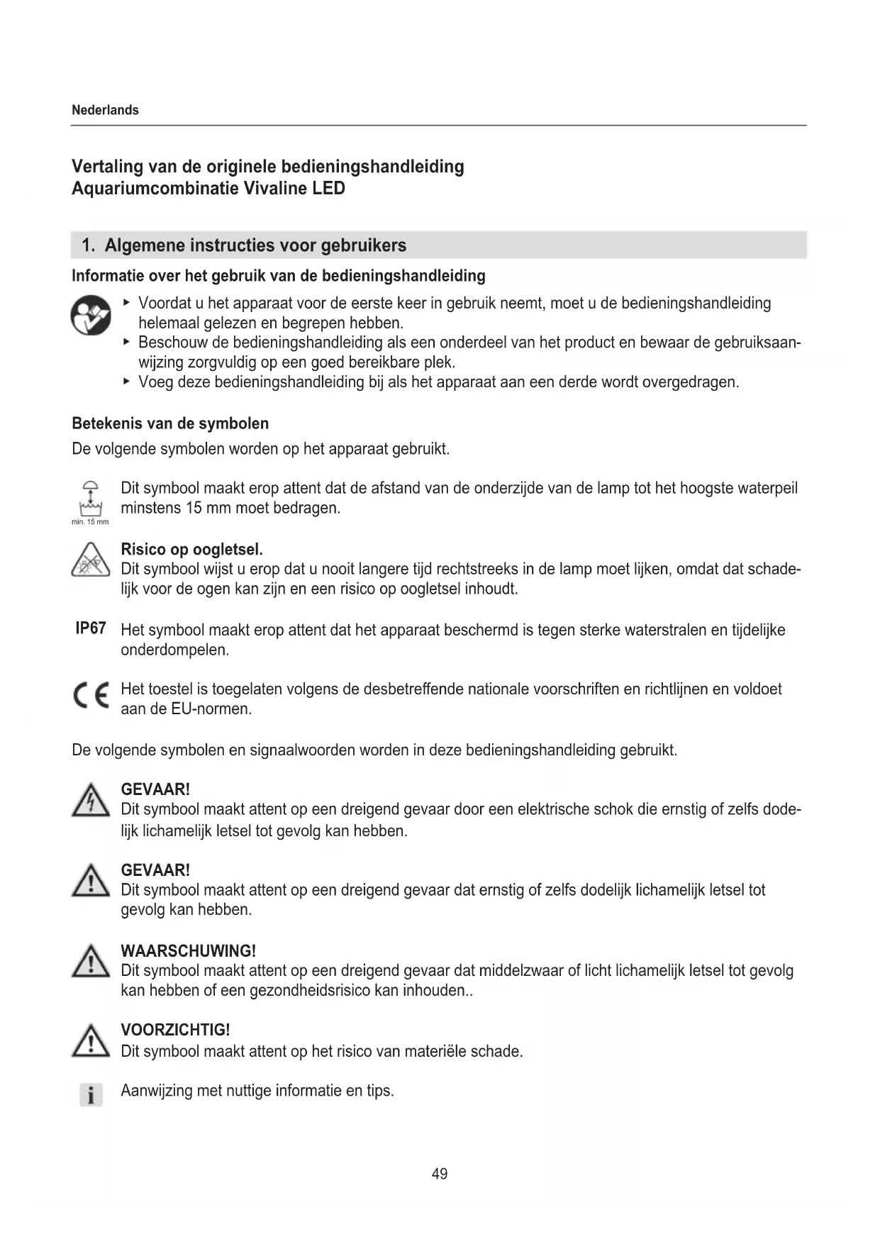 wijzing zorgvuldig op een goed bereikbare plek. ▶ Voeg deze bedieningshandleiding bij als het apparaat aan een derde wordt overgedragen. Betekenis van de symbolen De volgende symbolen worden op het apparaat gebruikt. Dit symbool maakt erop attent dat de afstand van de onderzijde van de lamp tot het hoogste waterpeil minstens 15 mm moet bedragen. Risico op oogletsel. Dit symbool wijst u erop dat u nooit langere tijd rechtstreeks in de lamp moet lijken, omdat dat schade