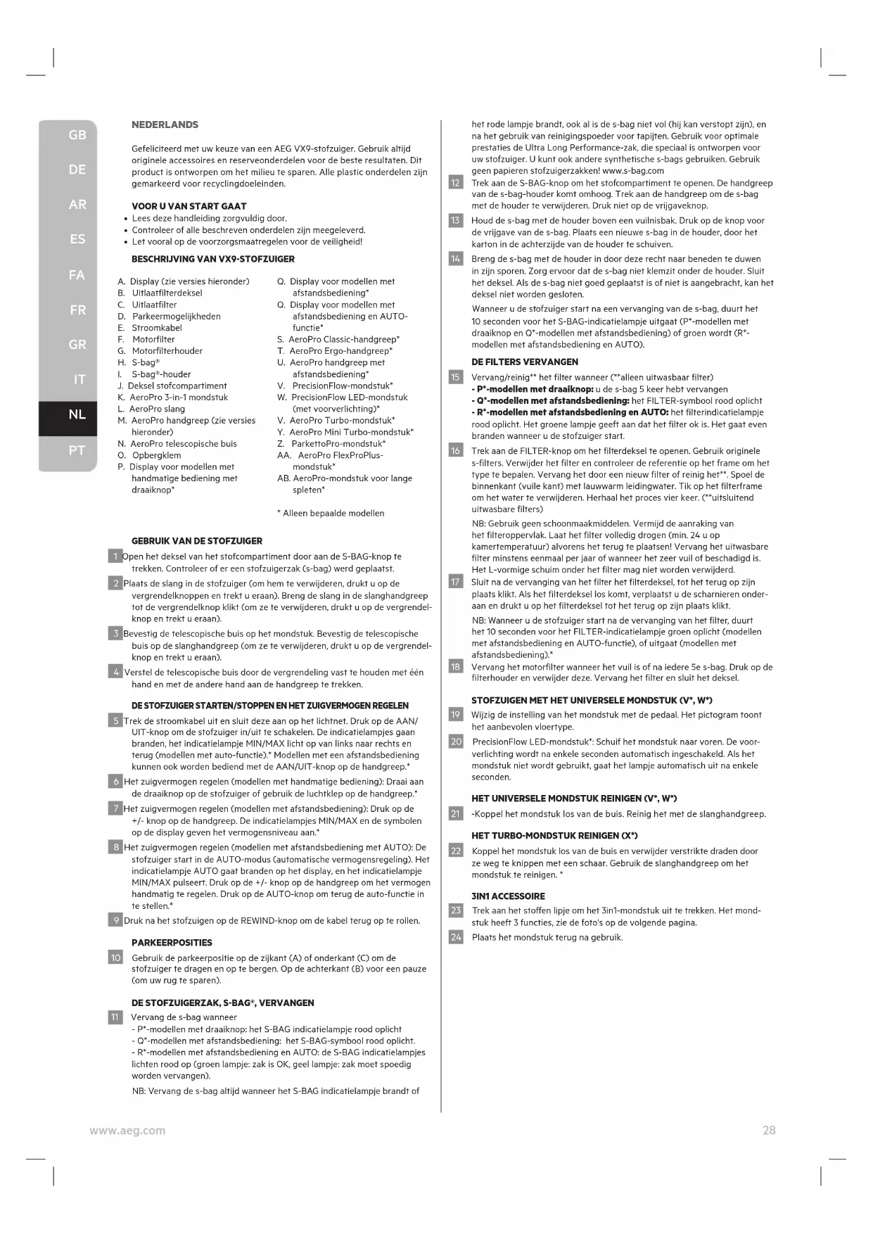 PT28 www.aeg.com NEDERLANDS Gefeliciteerd met uw keuze van een AEG VX9-stofzuiger. Gebruik altijd originele accessoires en reserveonderdelen voor de beste resultaten. Dit product is ontworpen om het milieu te sparen. Alle plastic onderdelen zijn gemarkeerd voor recyclingdoeleinden.