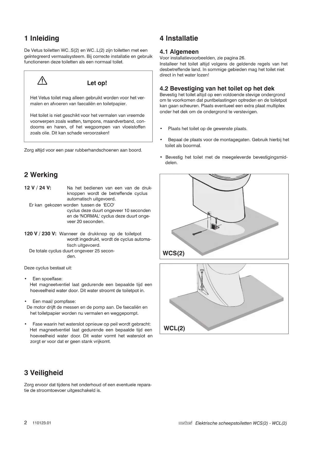 Elektrische scheepstoiletten WCS(2) - WCL(2) 1 Inleiding De Vetus toiletten WC..S(2) en WC..L(2) zijn toiletten met een geïntegreerd vermaalsysteem. Bij correcte installatie en gebruik functioneren deze toiletten als een normaal toilet.