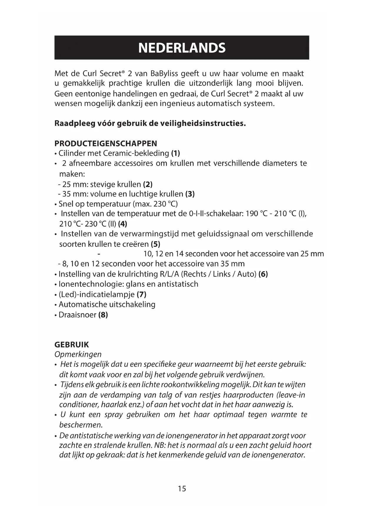 De buitenkant van het apparaat kan worden afgeveegd met een vochtig doekje, wanneer het apparaat eenmaal is afgekoeld en de stekker uit het stopcontact is. Zorg ervoor dat het apparaat helemaal droog is voordat u het opnieuw aanzet. RC-16_C1300E-no tool_IB.indd 18 18/08/16 09:0919 ITALIANO Curl Secret® 2 di BaByliss consente di dare volume ai capelli e creare splendidi ricci con una tenuta eccezionale nel massimo comfort. Nessuna manipolazione fastidiosa, nessun movimento da eseguire, Curl Secret® 2 realizza qualsiasi desiderio grazie all’ingegnoso sistema automatico. Leggere prima le istruzioni di sicurezza.