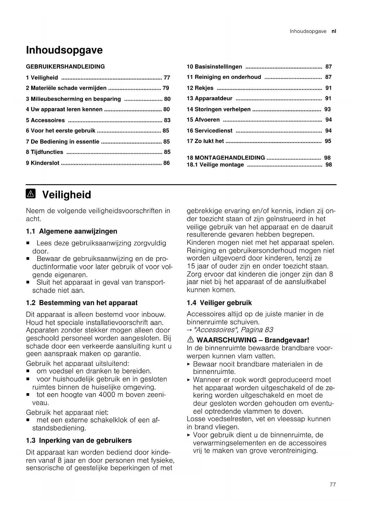 Wanner er rook wordt geproduerd moet het apparaat worden uitgeschakeld of de zekering worden uitgeschakeld en moet de deur gesloten worden gehonden om eventueel optredende vlammen te doven.