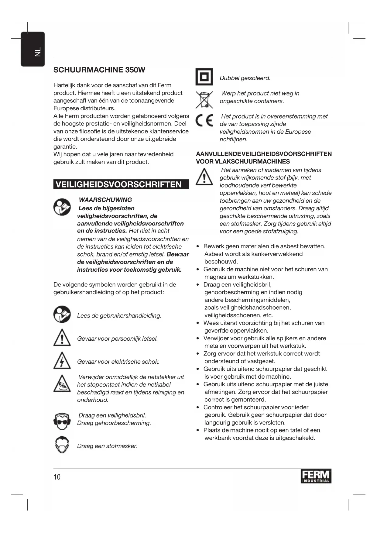 SCHUURMACHINE 350W Hartelijk dank voor de aanschaf van dit Ferm product. Hiermee heeft u een uitstekend product aangeschaft van één van de toonaangevende Europese distributeurs. Alle Ferm producten worden gefabriceerd volgens de hoogste prestatie- en veiligheidsnormen. Deel van onze filosofie is de uitstekende klantenservice die wordt ondersteund door onze uitgebreide garantie. Wij hopen dat u vele jaren naar tevredenheid gebruik zult maken van dit product. VEILIGHEIDSVOORSCHRIFTEN WAARSCHUWING Lees de bijgesloten veiligheidsvoorschriften, de aanvullende veiligheidsvoorschriften en de instructies. Het niet in acht nemen van de veiligheidsvoorschriften en de instructies kan leiden tot elektrische schok, brand en/of ernstig letsel. Bewaar de veiligheidsvoorschriften en de instructies voor toekomstig gebruik. De volgende symbolen worden gebruikt in de gebruikershandleiding of op het product: Lees de gebruikershandleiding. Gevaar voor persoonlijk letsel. Gevaar voor elektrische schok. Verwijder onmiddellijk de netstekker uit het stopcontact indien de netkabel beschadigd raakt en tijdens reiniging en onderhoud. Draag een veiligheidsbril. Draag gehoorbescherming. Draag een stofmasker. Dubbel geïsoleerd. Werp het product niet weg in ongeschikte containers. Het product is in overeenstemming met de van toepassing zijnde veiligheidsnormen in de Europese richtlijnen. AANVULLENDE VEILIGHEIDSVOORSCHRIFTEN VOOR VLAKSCHUURMACHINES Het aanraken of inademen van tijdens gebruik vrijkomende stof (bijv. met loodhoudende verf bewerkte oppervlakken, hout en metaal) kan schade toebrengen aan uw gezondheid en de gezondheid van omstanders. Draag altijd geschikte beschermende uitrusting, zoals een stofmasker. Zorg tijdens gebruik altijd voor een goede stofafzuiging.
