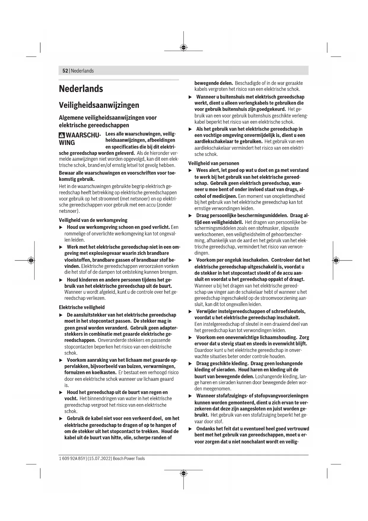 Het in deze gebruiksaanwijzing vermelde trillingsniveau en de geluidsemissiewaarde zijn gemeten met eengenormeer- de meetmethode en kunnen worden gebruikt om elektrische gereedschappen met elkaar te vergelijken. Ze zijn ook ge- schikt voor een voorlopige inschatting van de trillings- en ge- luidsemissie. Het aangegeven trillingsniveau en de aangegeven ge- luidsemissiewaarde representeren de voornaamste toepas- singen van het elektrische gereedschap. Wanneer het elek- trische gereedschap echter wordt gebruikt voor andere toe- passingen, met afwijkende inzetgereedschappen of onvol- doende onderhoud, dan kunnen het trillingsniveau en de ge- luidsemissiewaarde afwijken. Dit kan de trillings- en ge- luidsemissie gedurende de gehele arbeidsperiode duidelijk verhogen. Voor een nauwkeurige schatting van de trillings- en ge- luidsemissies moet ook rekening worden gehouden met de tijden waarin het gereedschap uitgeschakeld is, of waarin het gereedschap wel loopt, maar niet werkelijk wordt ge- bruikt. Dit kan de trillings- en geluidsemissies gedurende de gehele arbeidsperiode duidelijk verminderen. Leg aanvullende veiligheidsmaatregelen ter bescherming van de gebruiker tegen het effect van trillingen vast, zoals: onderhoud van elektrische gereedschappen en inzetgereed- schappen, warm houden van de handen, organisatie van het arbeidsproces. Montage u Neem vóór alle werkzaamheden aan het elektrische gereedschap (zoals het uitvoeren van onderhoud of het wisselen van inzetgereedschappen e.d.) en vóór het vervoeren en opbergen altijd de accu uit het elek- trische gereedschap. Bij per ongeluk bedienen van de aan/uit-schakelaar bestaat gevaar voor letsel. Accu opladen (zie afbeeldingA) u Gebruik alleen de in de technische gegevens vermelde oplaadapparaten. Alleen deze oplaadapparaten zijn af- gestemd op de bij het elektrische gereedschap gebruikte Li-Ion-accu. Aanwijzing: De accu wordt gedeeltelijk geladen geleverd. Om de volledige capaciteit van de accu te verkrijgen, laadt u voor het eerste gebruik de accu volledig in het oplaadappa- raat op. De Lithium-Ion-accu kan op elk moment worden opgeladen zonder de levensduur te verkorten. Een onderbreking van het opladen schaadt de accu niet. De Li-Ion-accu is door de „Electronic Cell Protection (ECP)“ tegen diepontlading beschermd. Als de accu leeg is, wordt het elektrische gereedschap door een veiligheidsschakeling uitgeschakeld. Het inzetgereedschap beweegt niet meer. u Druk na het automatisch uitschakelen van het elektri- sche gereedschap niet meer op de aan/uit-schakelaar. De accu kan anders beschadigd worden. Voor het verwijderen van de accu (1) drukt u op de ontgren- delingstoets (2) en trekt u de accu naar onder toe uit het elektrische gereedschap. Gebruik daarbij geen geweld. Accu-oplaadaanduiding De drie groene LED's van de accu-oplaadaanduiding(4) ge- ven de laadtoestand van de accu(1) aan. De oplaadaandui- ding brandt slechts 5 seconden na het inschakelen. LED Capaciteit Permanent licht 3x groen ≥2/3 Permanent licht 2x groen ≥1/3 Permanent licht 1x groen <1/3 Bosch Power Tools 1 609 92A 85Y | (15.07.2022)56 | Nederlands LED Capaciteit Knipperlicht 1x groen Reserve Knipperlicht 3x groen Leeg Brandt na het inschakelen geen LED, dan is de accu defect en moet deze vervangen worden. Zaagblad bevestigen of vervangen u Draag werkhandschoenen bij de montage of het wis- selen van het inzetgereedschap. Accessoires zijn scherp en kunnen bij langer gebruik heet worden. Zaagblad kiezen Een overzicht van geadviseerde zaagbladen vindt u aan het einde van deze gebruiksaanwijzing. Plaats alleen zaagbladen met enkele nokkenschacht (T-schacht). Het zaagblad mag niet langer zijn dan nodig is voor de gewenste zaagsnede. Gebruik voor het zagen van nauwe bochten een smal zaag- blad. Zaagblad bevestigen (zie afbeeldingB) u Reinig de schacht van het zaagblad vóór het bevesti- gen. Een vervuilde schacht kan niet stevig bevestigd wor- den. Schuif het zaagblad (13), met de tanden in zaagrichting, tot het vastklikken in de zaagbladopname (11). De SDS-hendel (20) springt automatisch naar achter en het zaagblad wordt vergrendeld. Duw de hendel (20) niet met de hand naar ach- ter. Anders kunt u het elektrische gereedschap beschadigen. Let er bij het bevestigen van het zaagblad op dat de rug van het zaagblad in de groef van het steunwiel (10) ligt. u Controleer of het zaagblad stevig vastzit. Een los zaag- blad kan uit de zaaghouder vallen en kan u verwonden. Zaagblad uitwerpen (zie afbeeldingC) u Houd het elektrische gereedschap bij het uitwerpen van het zaagblad zodanig dat er geen personen of die- ren gewond worden door het uitgeworpen zaagblad. Draai de SDS-hendel (20) tot aan de aanslag in de richting van de aanraakbeveiliging (21) naar voren. Het zaagblad wordt gelost en uitgeworpen. Glijvoet (zie afbeeldingD) Bij de bewerking van kwetsbare oppervlakken kunt u de glij- voet (17) op de voetplaat (9) plaatsen, om krassen op het oppervlak te voorkomen. Voor het plaatsen van de glijvoet (17) hangt u deze voor op de voetplaat (9) in, duwt u deze achter omhoog en laat u de- ze vastklikken. Antisplinterplaatje (zie afbeeldingE) Het antisplinterplaatje (18) (accessoire) kan het versplinte- ren van het oppervlak bij het zagen van hout verhinderen. Het antisplinterplaatje kan alleen bij bepaalde zaagbladtypes en alleen bij een zaaghoek van 0° gebruikt worden. Schuif het antisplinterplaatje(18) vanaf de voorkant in de voetplaat(9). Bij gebruik van de glijvoet (17) wordt het antisplinterplaatje (18) niet in de voetplaat (9), maar in de glijvoet geplaatst. Afzuiging van stof en spanen Stof van materialen zoals loodhoudende verf, enkele hout- soorten, mineralen en metaal kan schadelijk voor de gezond- heid zijn. Aanraking of inademing van stof kan leiden tot al- lergische reacties en/of luchtwegaandoeningen bij de ge- bruiker of personen die zich in de omgeving bevinden. Bepaalde soorten stof, bijvoorbeeld van eiken- en beuken- hout, gelden als kankerverwekkend, in het bijzo