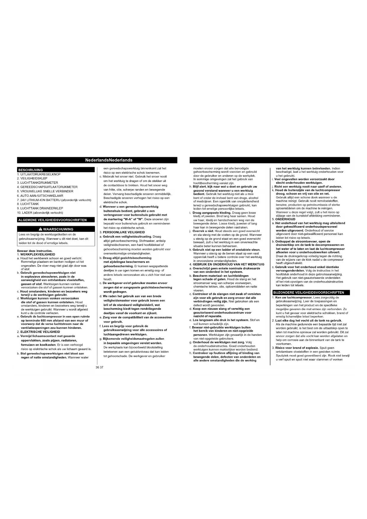 19. Volg altijd alle veiligheidsinstructies die door de fabrikant van uw luchtaangedreven werktuig worden aangeraden samen met alle veiligheidsinstructies voor de luchtcompressor.