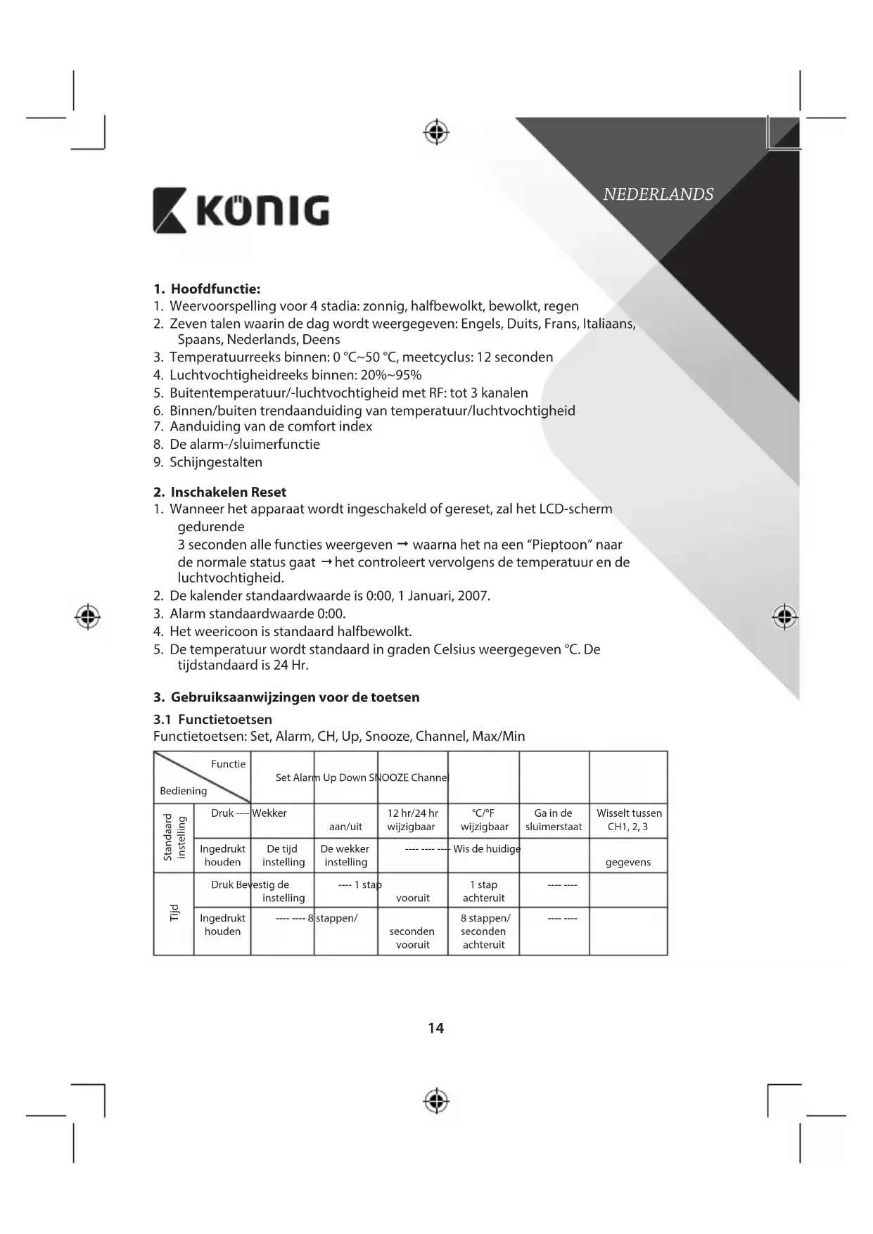 Functietoetsen: Set, Alarm, CH, Up, Snooze, Channel, Max/Min Functie Bediening Set Alarm Up Down SNOOZE Channel Standaard instelling Druk ---- Wekker aan/uit 12 hr/24 hr wijzigbaar °C/°F wijzigbaar Ga in de sluimerstaat Wisselt tussen CH1, 2, 3 Ingedrukt houden De tijd instelling De wekker instelling ---- ---- ---- Wis de huidige gegevens Tijd Druk Bevestig de instelling ---- 1 stap vooruit 1 stap achteruit
