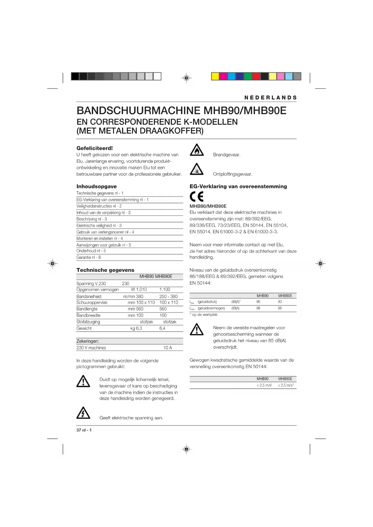 Spanning V 230 230 Opgenomen vermogen W 1.010 1.100 Bandsnelheid m/min 380 250 - 380 Schuuroppervlak mm 100 x 110 100 x 110 Bandlengte mm 560 560 Bandbreedte mm 100 100 Stofafzuiging stofzak stofzak Gewicht kg 6,3 6,4 Zekeringen: 230 V machines 10 A In deze handleiding worden de volgende pictogrammen gebruikt: Duidt op mogelijk lichamelijk letsel, levensgevaar of kans op beschadiging van de machine indien de instructies in deze handleiding worden genegeerd. Geeft elektrische spanning aan. Brandgevaar. Ontploffingsgevaar. EG-Verklaring van overeenstemming