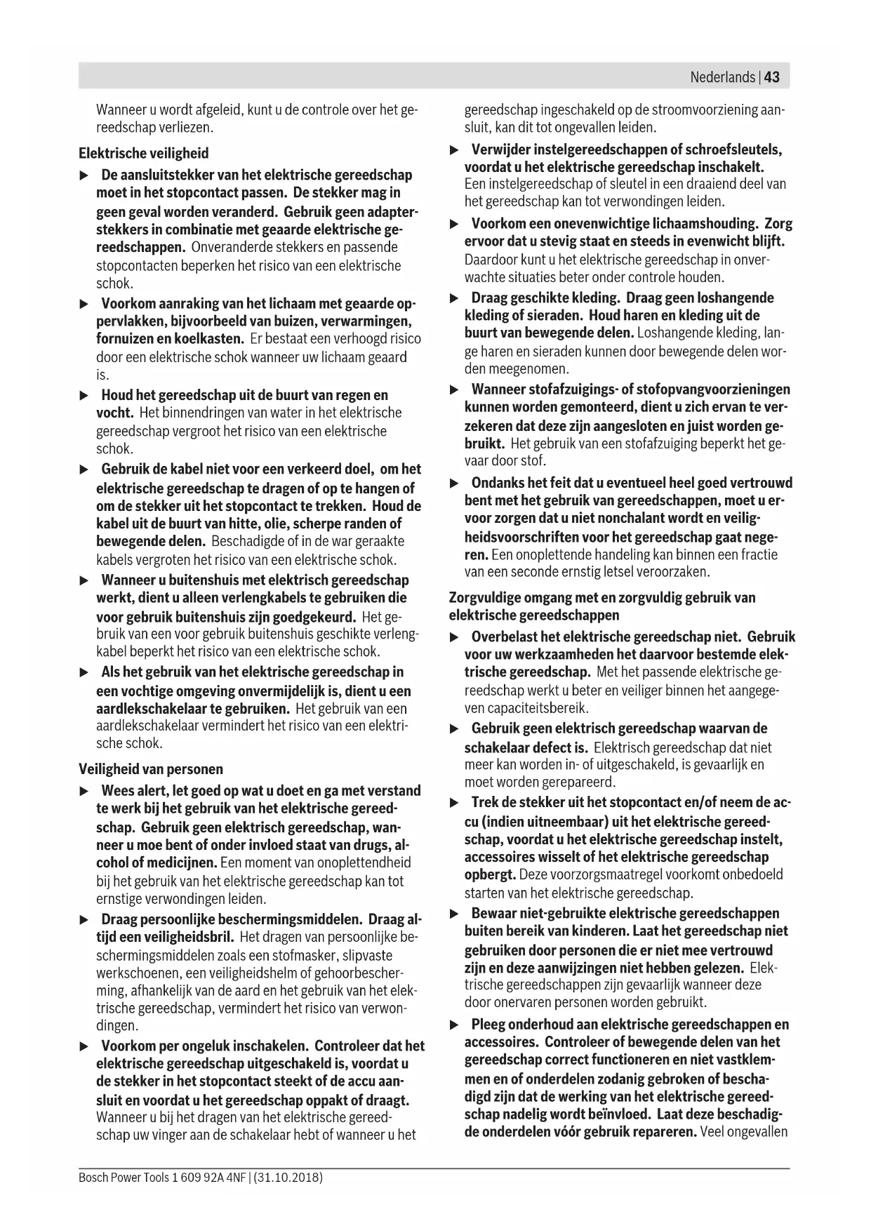 en bij opslag °C -20... +50 -20... +50 Aanbevolen accu's GBA 12V... GBA 10,8V... GBA 12V... GBA 10,8V... Aanbevolen oplaadapparaten GAL 12.. CV AL 11.. CV GAL 12V-.. GAX 18V-30 GAL 12.. CV AL 11.. CV GAL 12V-.. GAX 18V-30 A) afhankelijk van gebruikte accu B) beperkt vermogen bij temperaturen <0 °C Bosch Power Tools 1 609 92A 4NF | (31.10.2018)46 | Nederlands Informatie over geluid en trillingen Geluidsemissiewaarden vastgesteld conform EN 60745-2-1/EN 62841-2-2. Het A-gewogen geluidsdrukniveau van het elektrische ge- reedschap bedraagt typisch 72dB(A). Onzekerheid K = 3 dB. Het geluidsniveau bij het werken kan 80dB(A) over- schrijden. Draag gehoorbescherming! Totale trillingswaarden a
