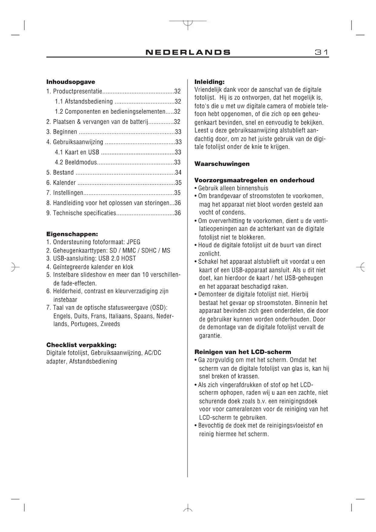 Engels, Duits, Frans, Italiaans, Spaans, Neder- lands, Portugees, Zweeds Checklist verpakking: Digitale fotolijst, Gebruiksaanwijzing, AC/DC adapter, Afstandsbediening Inleiding: Vriendelijk dank voor de aanschaf van de digitale fotolijst. Hij is zo ontworpen, dat het mogelijk is, foto's die u met uw digitale camera of mobiele tele- foon hebt opgenomen, of die zich op een geheu- genkaart bevinden, snel en eenvoudig te bekijken. Leest u deze gebruiksaanwijzing alstublieft aan- dachtig door, om zo het juiste gebruik van de digi- tale fotolijst onder de knie te krijgen. Waarschuwingen Voorzorgsmaatregelen en onderhoud