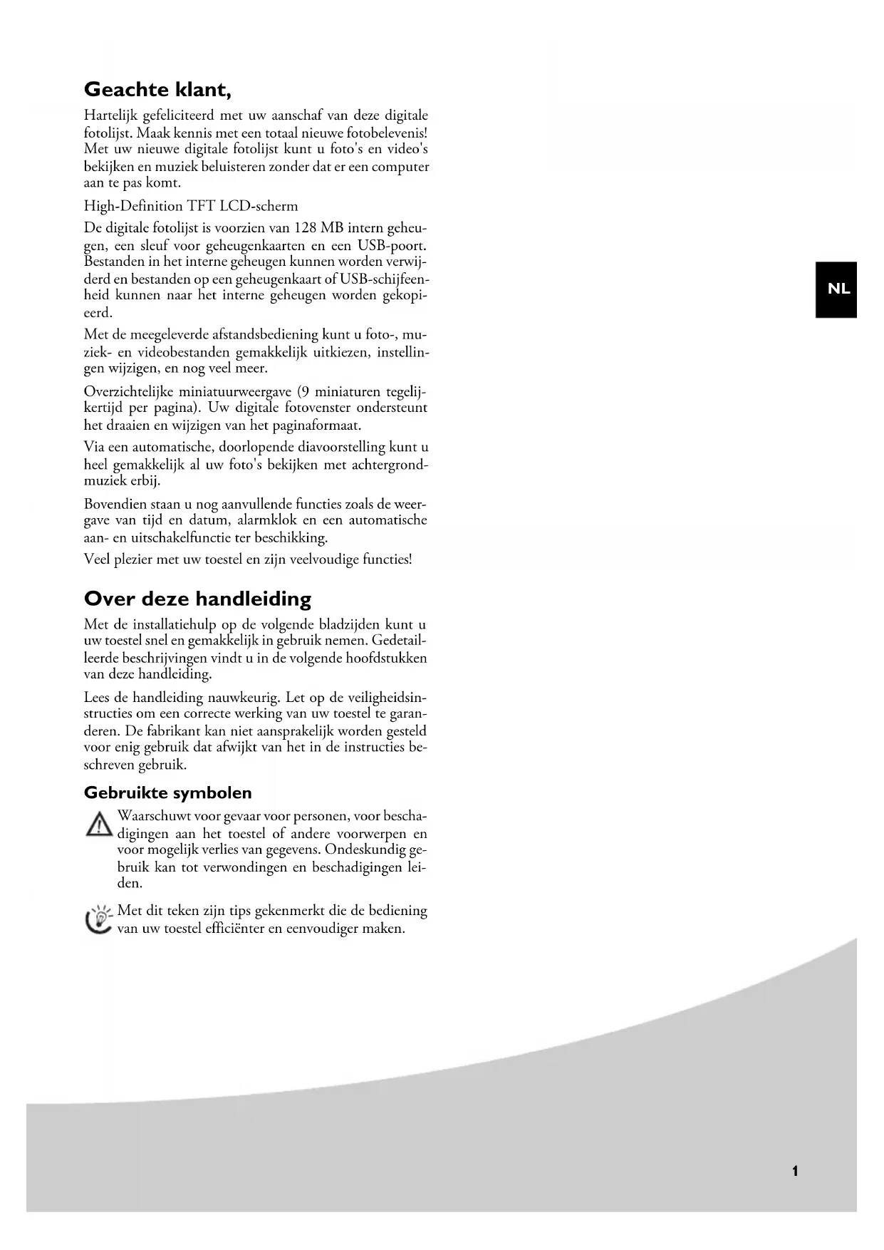 Hartelijk gefeliciteerd met uw aanschaf van deze digitale fotolijst. Maak kennis met een totaal nieuwe fotobelevenis! Met uw nieuwe digitale fotolijst kunt u foto's en video's bekijken en muziek beluisteren zonder dat er een computer aan te pas komt.