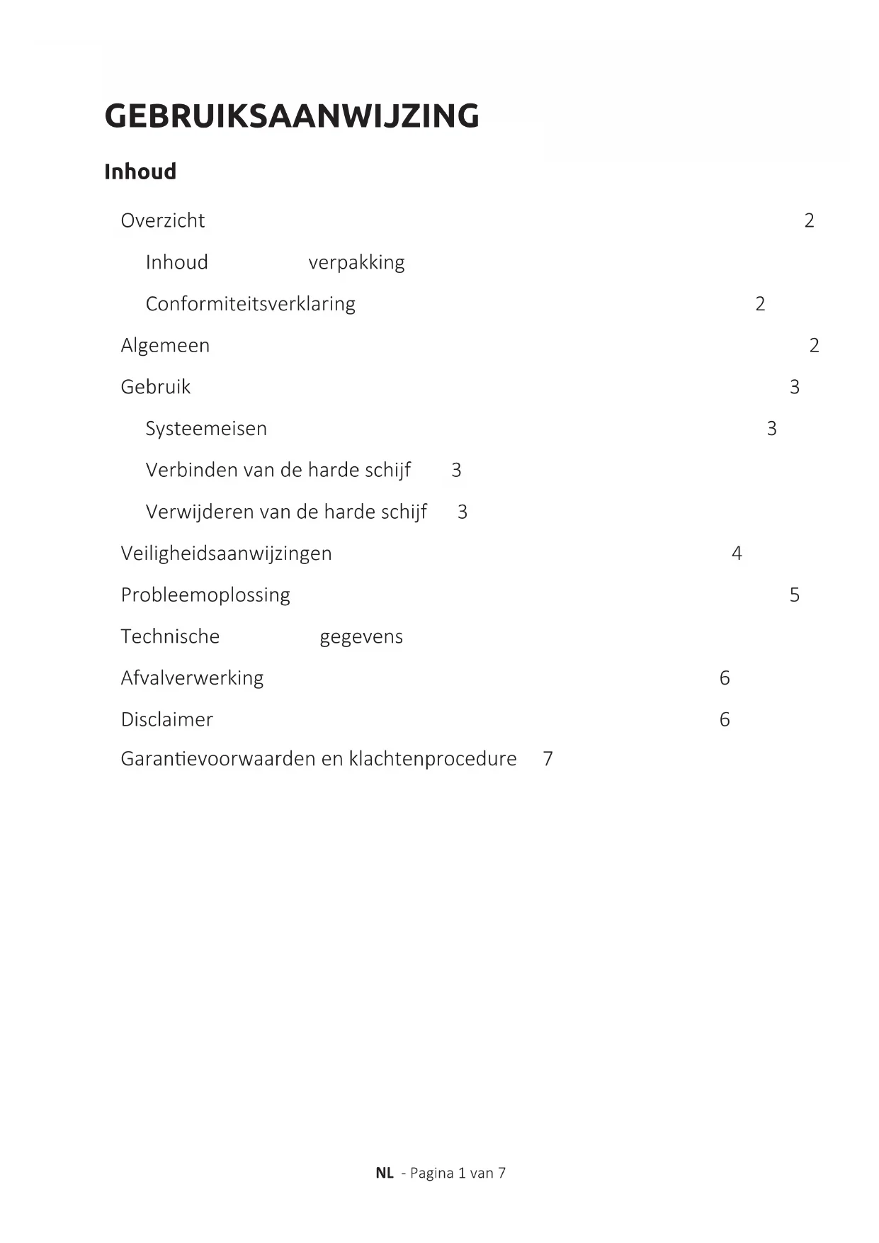 INTENSO INTERNATIONAL GMBH I Service Center (Votre numéro RMA) Kopernikusstraße 12-14 I D-49377 VechtaGEBRUIKSAANWIJZING NL - Pagina 1 van 7 Inhoud Overzicht 2 Inhoud verpakking 2 Conformiteitsverklaring 2 Algemeen 2 Gebruik 3 Systeemeisen 3 Verbinden van de harde schijf 3 Verwijderen van de harde schijf 3 Veiligheidsaanwijzingen 4 Probleemoplossing 5 Technische gegevens 5 Afvalverwerking 6 Disclaimer 6 Garanevoorwaarden en klachtenprocedure 7NL - Pagina 2 van 7 Lees deze gebruiksaanwijzing zorgvuldig door en neem alle in deze gebruiksaanwijzing vermelde aanwijzingen in acht en volg ze op, om een lange levensduur en betrouwbare werking van het apparaat te kunnen garanderen. Berg deze gebruiksaanwijzing onder handbereik op en geef deze door aan andere gebruikers van het apparaat. Over deze gebruiksaanwijzing ALGEMEEN Conformiteitsverklaring Het CE-merk gee aan dat dit product voldoet aan de vereisten van alle toepasselijke EU- richtlijnen voor dit product. Inhoud verpakking OVERZICHT Het hoofddoel van deze harde schijf of harddisk is opslag van gegevens van pc‘s, notebooks, ultra- books en Mac-computers. Dit product is niet bedoeld voor commercieel gebruik of voor medische en speciale toepassingen waarbij uitval van het product verwondingen, de dood of aanzienlijke zaakschade veroorzaken kan. In geval van gebruik dat niet overeenkomsg het doel is, vervalt garane en aansprakelijkheid. Openen en ombouwen van het apparaat en gebruik van randap- paratuur en toebehoren die niet goedgekeurd zijn door ons dient achterwege gelaten te worden. Gebruik het apparaat niet in extreme omgevingsomstandigheden en houd u aan de veiligheid- saanwijzingen. Als u de informae en de veiligheidsaanwijzingen in deze gebruiksaanwijzing niet in acht neemt, dan geldt dat als niet in acht nemen van het doelovereenkomsg gebruik, wat leidt tot vervallen van de aansprakelijkheid en kan leiden tot personenschade en zaakschade. Gebruik overeenkomstig het doel