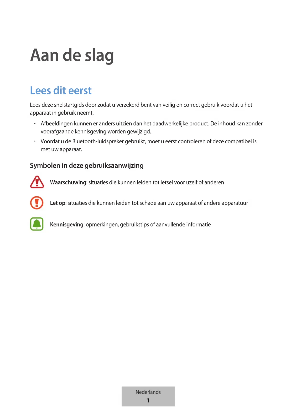 Voordat u de Bluetooth-luidspreker gebruikt, moet u eerst controleren of deze compatibel is met uw apparaat. Symbolen in deze gebruiksaanwijzing Waarschuwing: situaties die kunnen leiden tot letsel voor uzelf of anderen Let op: situaties die kunnen leiden tot schade aan uw apparaat of andere apparatuur Kennisgeving: opmerkingen, gebruikstips of aanvullende informatie Nederlands 1Aan de slag