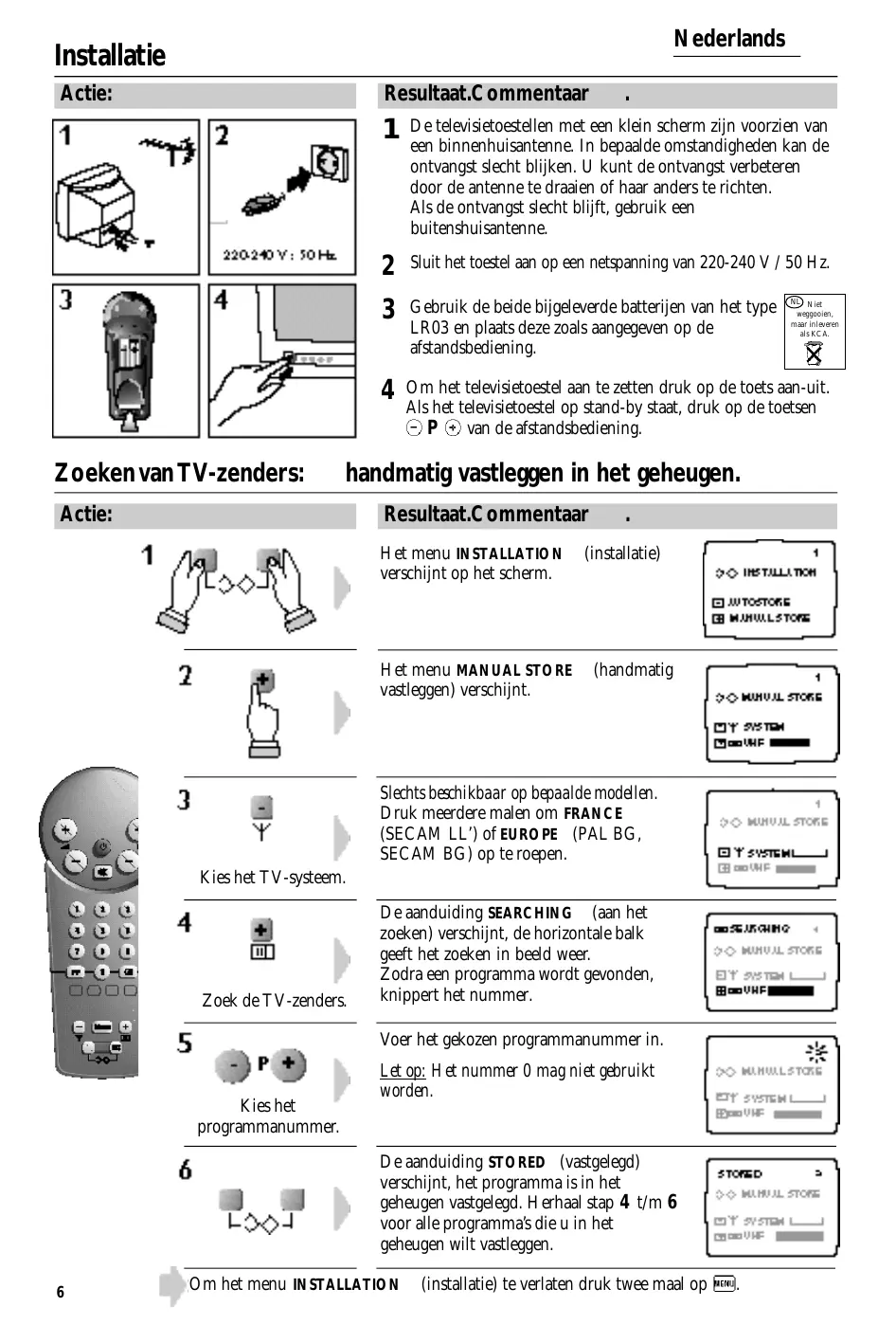 Om het televisietoestel aan te zetten druk op de toets aan-uit. Als het televisietoestel op stand-by staat, druk op de toetsen van de afstandsbediening. handmatig vastleggen in het geheugen. Actie: Resultaat.Commentaar Het menu INSTALLATION verschijnt op het scherm. Het menu MANUAL STORE vastleggen) verschijnt.