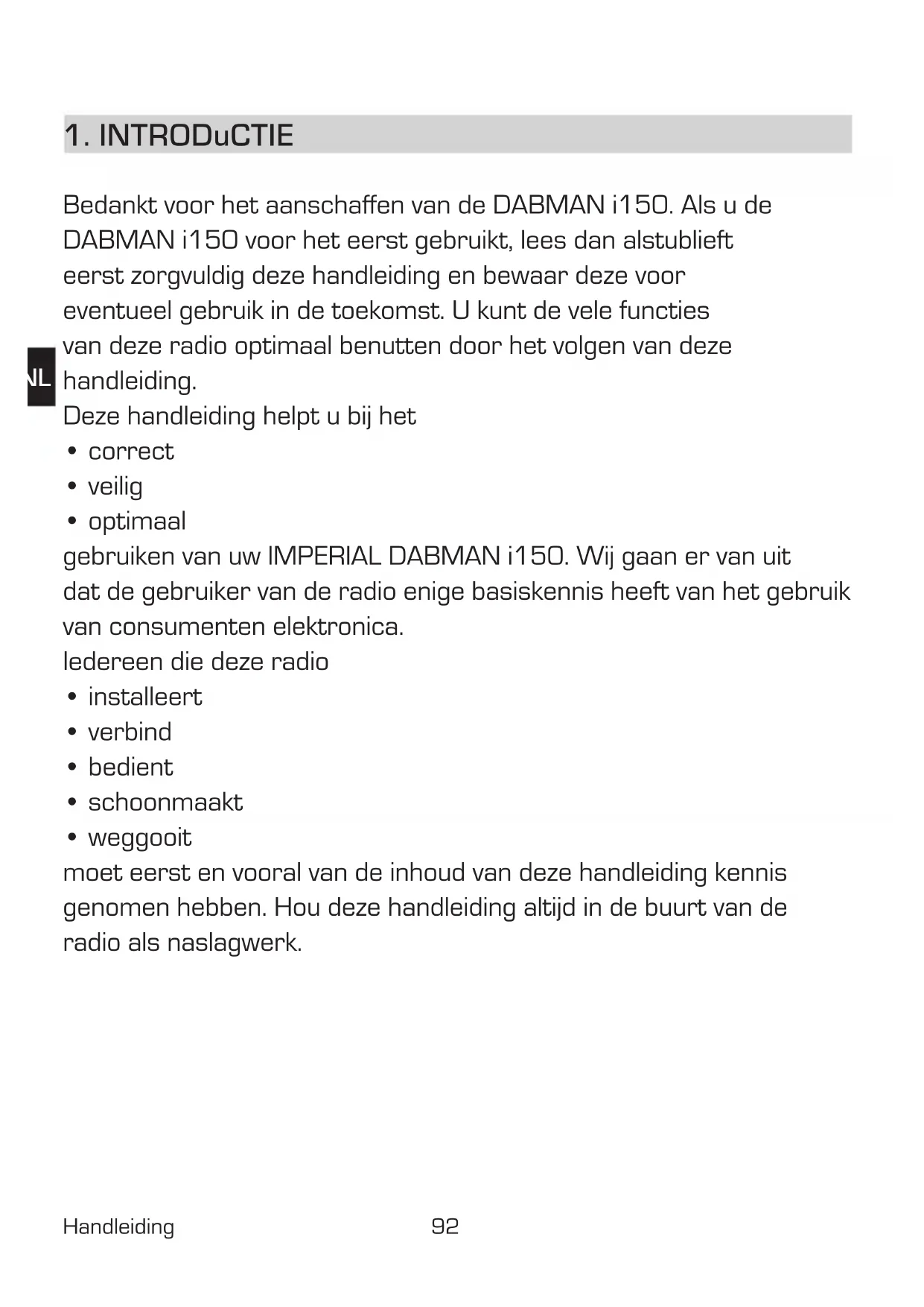 Bedankt voor het aanschaffen van de DABMAN i150. Als u de DABMAN i150 voor het eerst gebruikt, lees dan alstublieft eerst zorgvuldig deze handleiding en bewaar deze voor eventueel gebruik in de toekomst. U(Int sunt de vele functies van deze radio optimaal benutten door het volgen van deze handleiding.