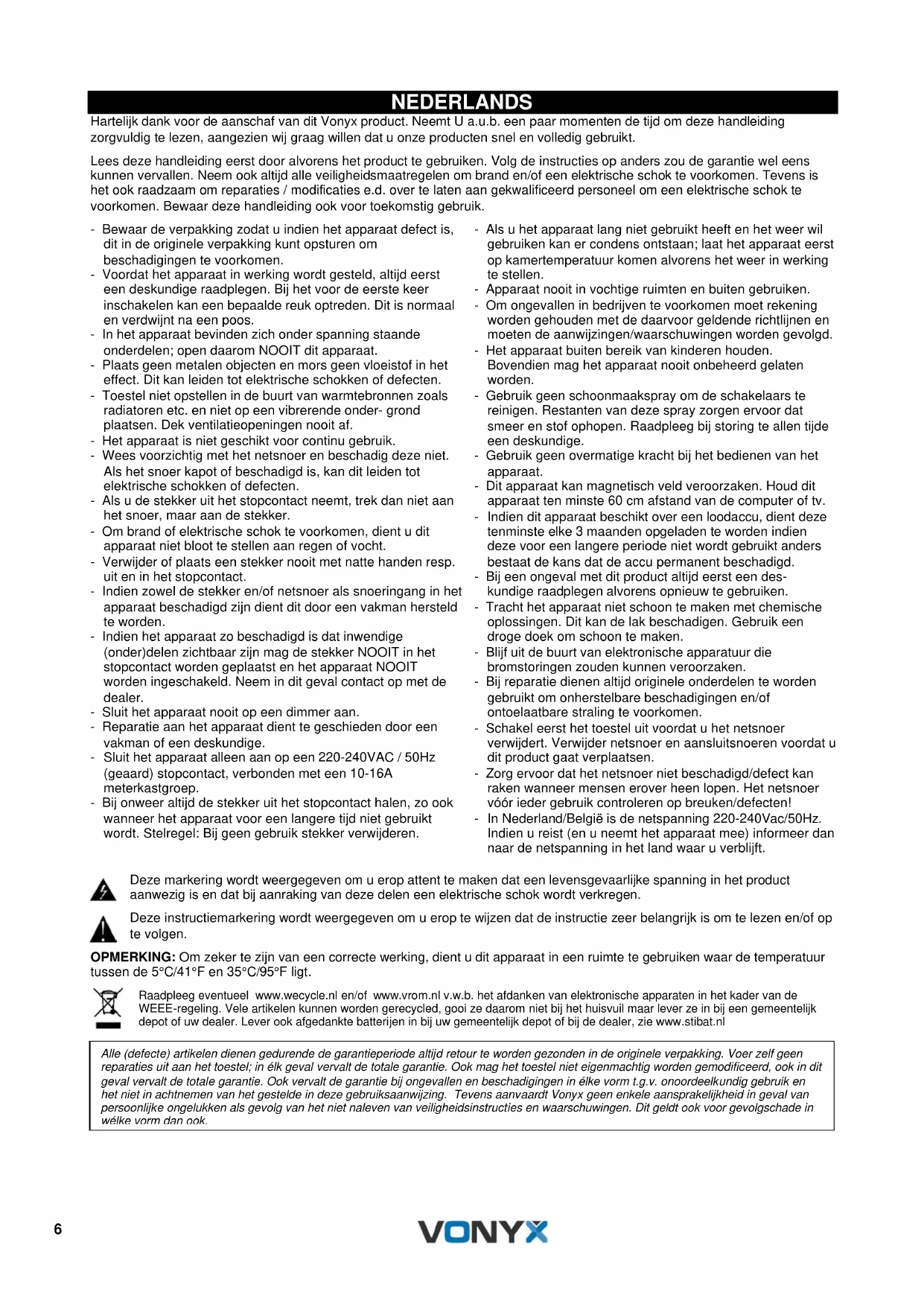Alle (defecte) artikelen dienen gedurende de garantieperiode altijd retour te worden gezonden in de originele verpakking. Voer zelf geen reparaties uit aan het toestel; in élk geval vervalt de totale garantie. Ook mag het toestel niet eigenmachtig worden gemodificeerd, ook in dit geval vervalt de totale garantie. Ook vervalt de garantie bij ongevallen en beschadigingen in élke vorm t.g.v. onoordeelkundig gebruik en het niet in achtnemen van het gestelde in deze gebruiksaanwijzing. Tevens aanvaardt Vonyx geen enkele aansprakelijkheid in geval van persoonlijke ongelukken als gevolg van het niet naleven van veiligheidsinstructies en waarschuwingen. Dit geldt ook voor gevolgschade in wélke vorm dan ook.7