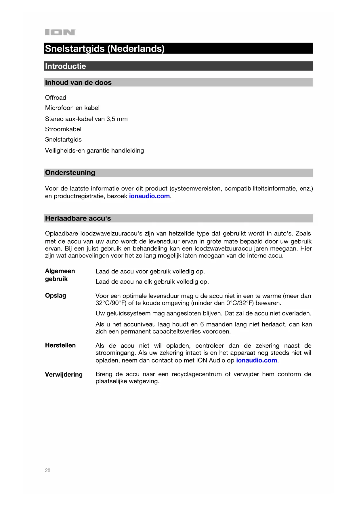 Herlaadbare accu's Oplaadbare loodzwavelzuuraccu's zijn van hetzelfde type dat gebruikt wordt in auto's. Zoals met de accu van uw auto wordt de levensduur ervan in grote mate bepaald door uw gebruik ervan. Bij een juist gebruik en behandeling kan een loodzwavelzuuraccu jaren meegaan. Hier zijn wat aanbevelingen voor het zo lang mogelijk laten meegaan van de interne accu. Algemeen gebruik Laad de accu voor gebruik volledig op. Laad de accu na elk gebruik volledig op. Opslag Voor een optimale levensduur mag u de accu niet in een te warme (meer dan 32°C/90°F) of te koude omgeving (minder dan 0°C/32°F) bewaren. Uw geluidssysteem mag aangesloten blijven. Dat zal de accu niet overladen. Als u het accuniveau laag houdt en 6 maanden lang niet herlaadt, dan kan zich een permanent capaciteitsverlies voordoen. Herstellen Als de accu niet wil opladen, controleer dan de zekering naast de stroomingang. Als uw zekering intact is en het apparaat nog steeds niet wil opladen, neem dan contact op met ION Audio op ionaudio.com. Verwijdering Breng de accu naar een recyclagecentrum of verwijder hem conform de plaatselijke wetgeving.29