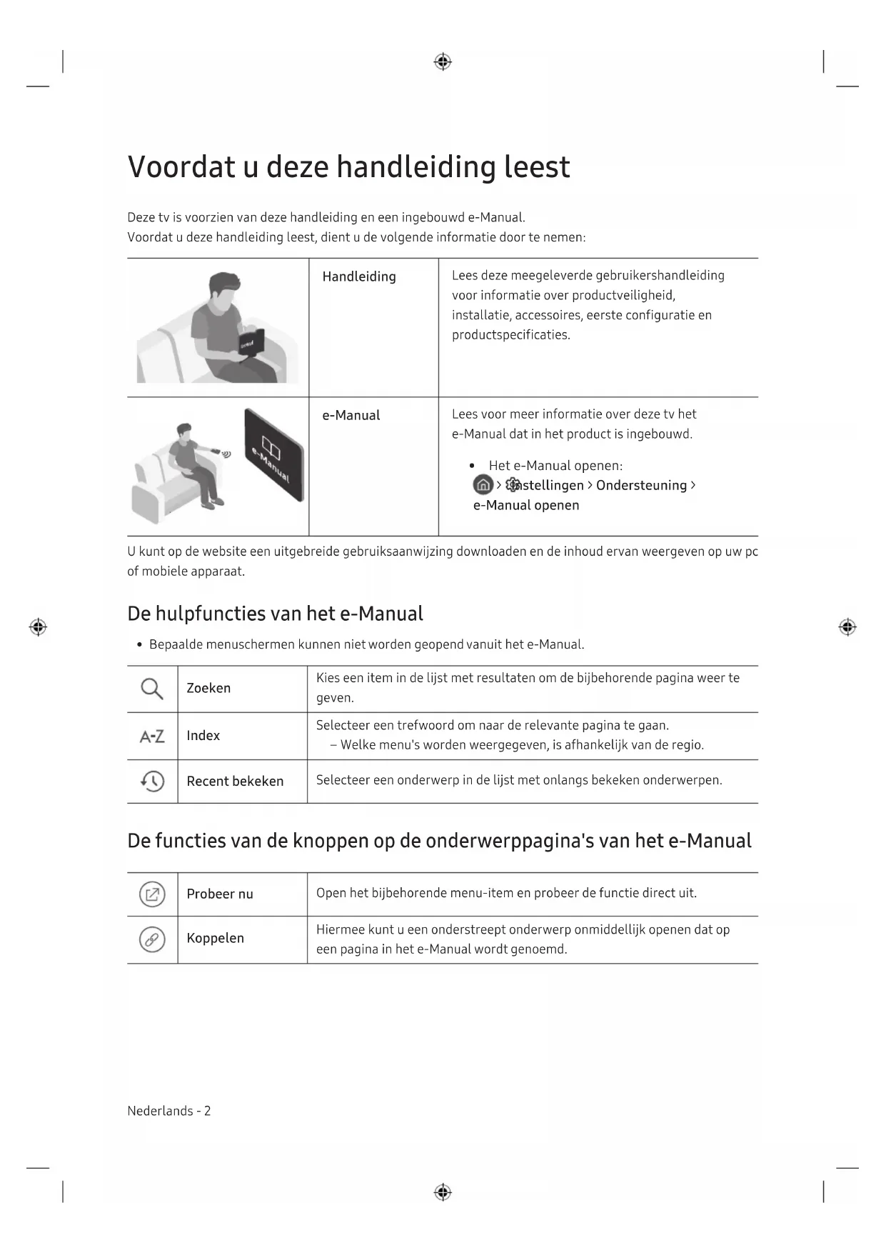 - Het e-Manual openen: > Instellingen > Ondersteuning > e-Manual openen U kunt op de website een uitgebreide gebruiksaanwijzing downloaden en de inhoud ervan weergeven op uw pc of mobiele apparaat. De hulpfuncties van het e-Manual