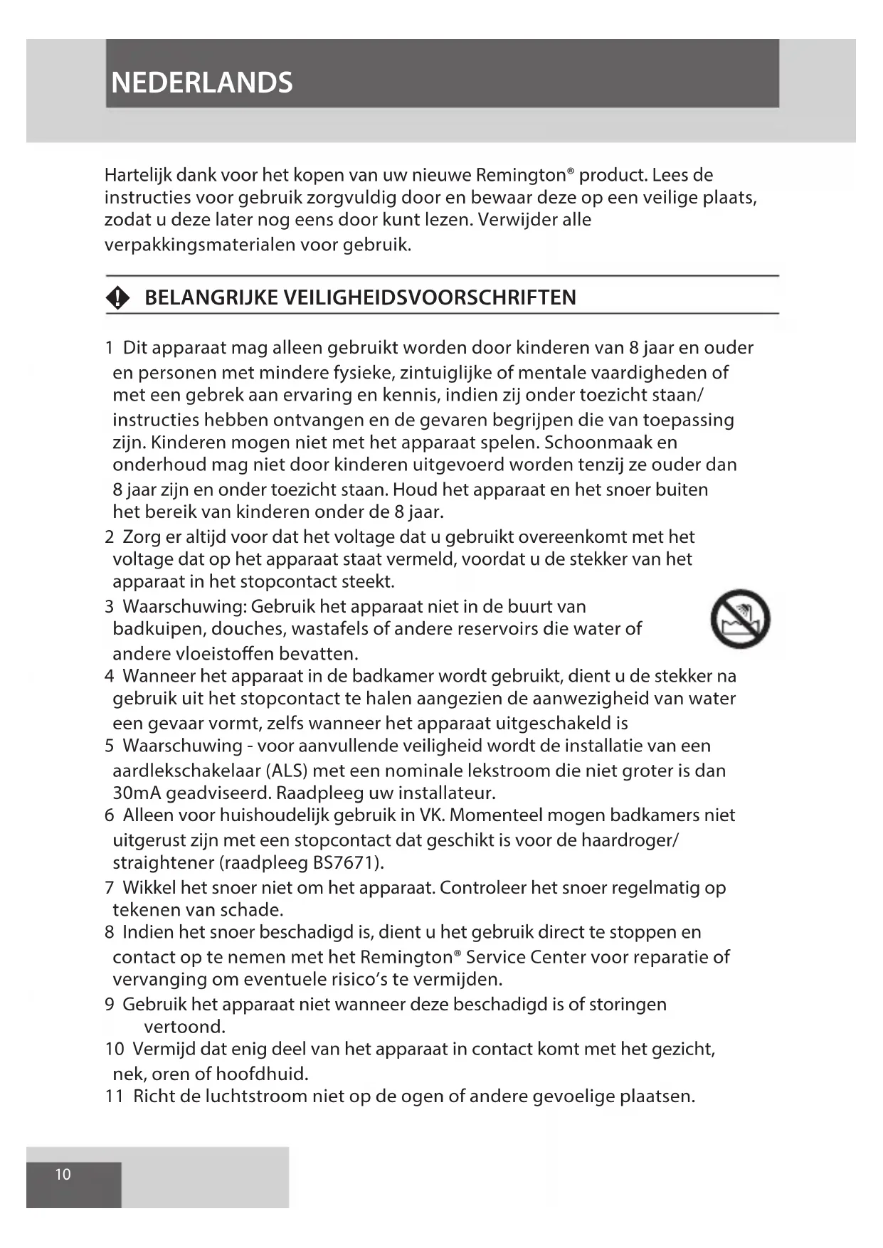8 Indien het snoer beschadigd is, dient u het gebruik direct te stoppen en contact op te nemen met het Remington® Service Center voor reparatie of vervanging om eventuele risico's te vermijden.